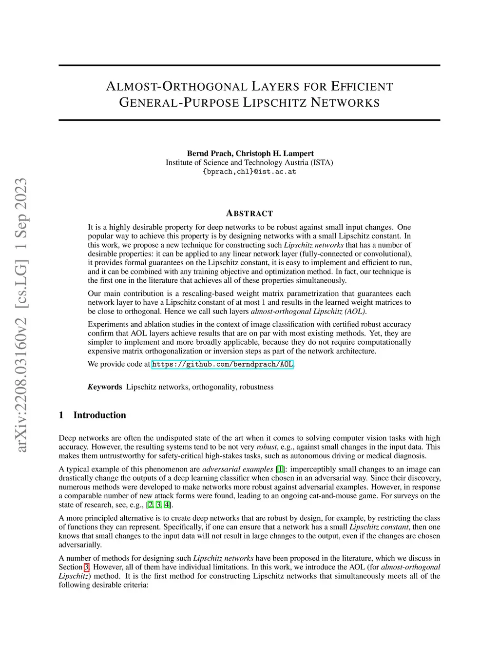 It is a highly desirable property for deep networks to be robust against small input changes. One popular way to achieve this property is by designing networks with a small Lipschitz constant. In this work, we propose a new technique for constructing such Lipschitz networks that has a number of desirable properties: it can be applied to any linear network layer (fully-connected or convolutional), it provides formal guarantees on the Lipschitz constant, it is easy to implement and efficient to run, and it can be combined with any training objective and optimization method. In fact, our technique is the first one in the literature that achieves all of these properties simultaneously. Our main contribution is a rescaling-based weight matrix parametrization that guarantees each network layer to have a Lipschitz constant of at most 1 and results in the learned weight matrices to be close to orthogonal. Hence we call such layers almost-orthogonal Lipschitz (AOL). Experiments and ablation studies in the context of image classification with certified robust accuracy confirm that AOL layers achieve results that are on par with most existing methods. Yet, they are simpler to implement and more broadly applicable, because they do not require computationally expensive matrix orthogonalization or inversion steps as part of the network architecture. We provide code at https://github.com/berndprach/AOL.