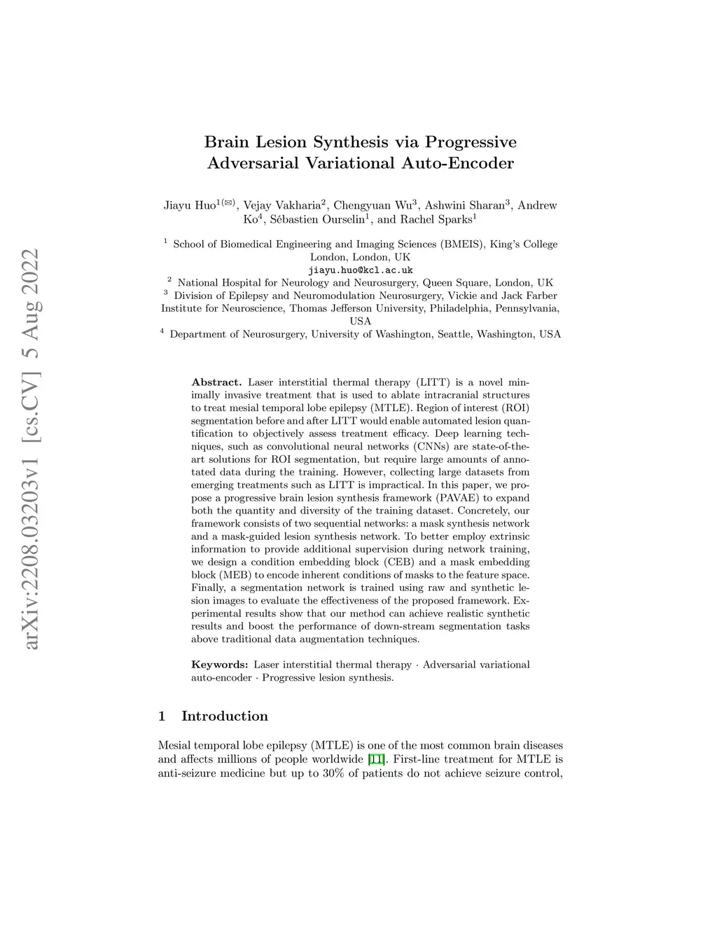 Laser interstitial thermal therapy (LITT) is a novel minimally invasive treatment that is used to ablate intracranial structures to treat mesial temporal lobe epilepsy (MTLE). Region of interest (ROI) segmentation before and after LITT would enable automated lesion quantification to objectively assess treatment efficacy. Deep learning techniques, such as convolutional neural networks (CNNs) are state-of-the-art solutions for ROI segmentation, but require large amounts of annotated data during the training. However, collecting large datasets from emerging treatments such as LITT is impractical. In this paper, we propose a progressive brain lesion synthesis framework (PAVAE) to expand both the quantity and diversity of the training dataset. Concretely, our framework consists of two sequential networks: a mask synthesis network and a mask-guided lesion synthesis network. To better employ extrinsic information to provide additional supervision during network training, we design a condition embedding block (CEB) and a mask embedding block (MEB) to encode inherent conditions of masks to the feature space. Finally, a segmentation network is trained using raw and synthetic lesion images to evaluate the effectiveness of the proposed framework. Experimental results show that our method can achieve realistic synthetic results and boost the performance of down-stream segmentation tasks above traditional data augmentation techniques.