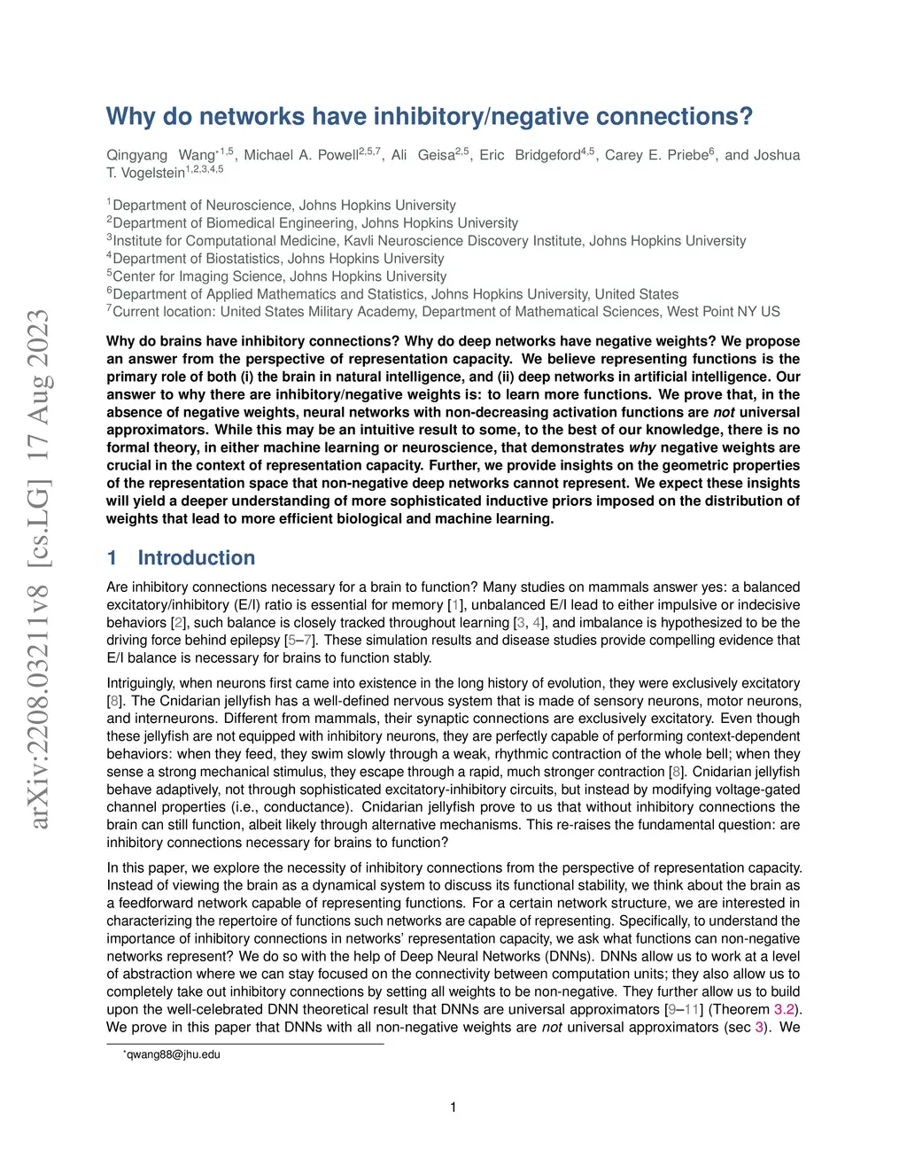 Why do brains have inhibitory connections? Why do deep networks have negative weights? We propose an answer from the perspective of representation capacity. We believe representing functions is the primary role of both (i) the brain in natural intelligence, and (ii) deep networks in artificial intelligence. Our answer to why there are inhibitory/negative weights is: to learn more functions. We prove that, in the absence of negative weights, neural networks with non-decreasing activation functions are not universal approximators. While this may be an intuitive result to some, to the best of our knowledge, there is no formal theory, in either machine learning or neuroscience, that demonstrates why negative weights are crucial in the context of representation capacity. Further, we provide insights on the geometric properties of the representation space that non-negative deep networks cannot represent. We expect these insights will yield a deeper understanding of more sophisticated inductive priors imposed on the distribution of weights that lead to more efficient biological and machine learning.