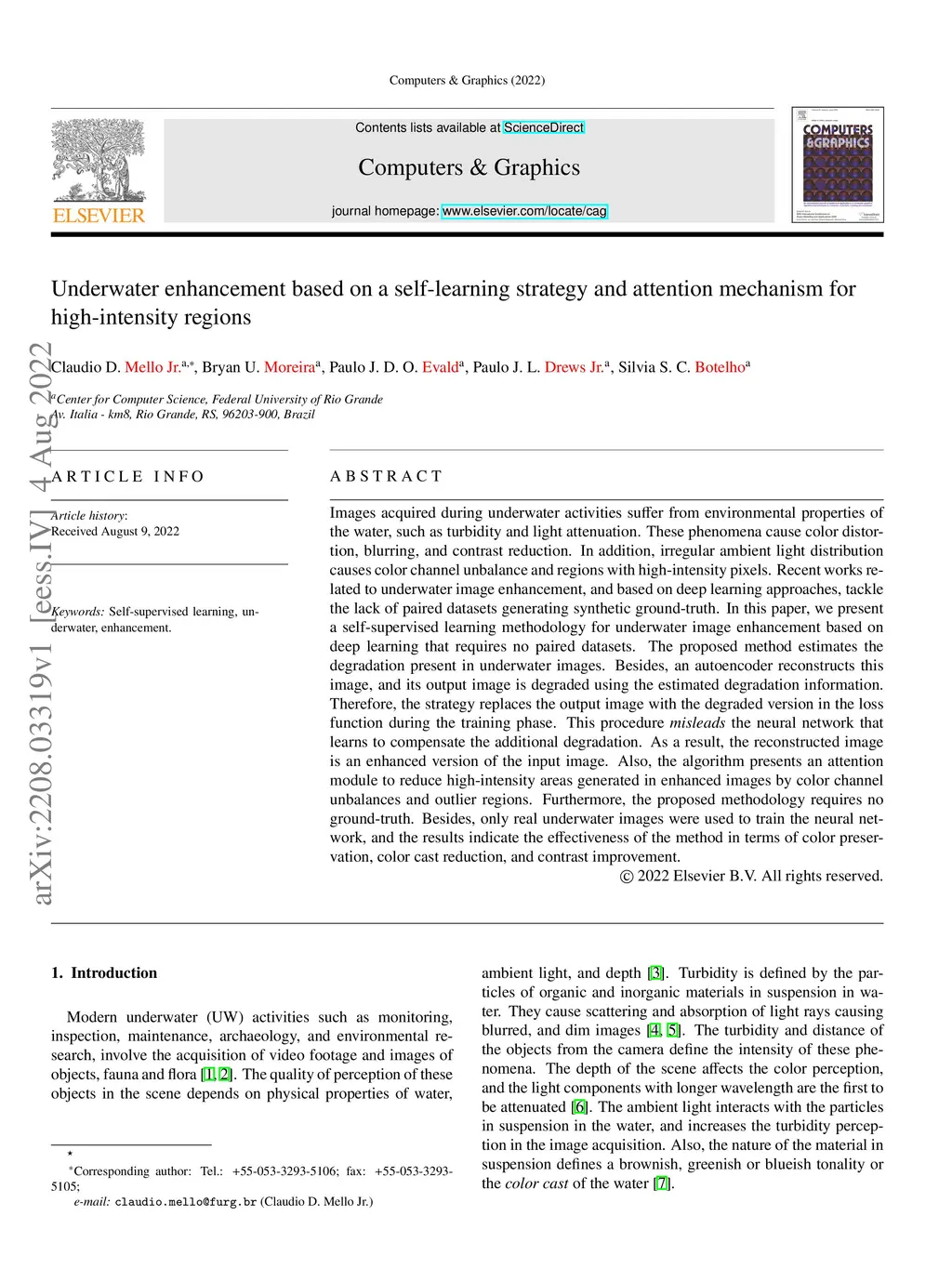 Images acquired during underwater activities suffer from environmental properties of the water, such as turbidity and light attenuation. These phenomena cause color distortion, blurring, and contrast reduction. In addition, irregular ambient light distribution causes color channel unbalance and regions with high-intensity pixels. Recent works related to underwater image enhancement, and based on deep learning approaches, tackle the lack of paired datasets generating synthetic ground-truth. In this paper, we present a self-supervised learning methodology for underwater image enhancement based on deep learning that requires no paired datasets. The proposed method estimates the degradation present in underwater images. Besides, an autoencoder reconstructs this image, and its output image is degraded using the estimated degradation information. Therefore, the strategy replaces the output image with the degraded version in the loss function during the training phase. This procedure \textit{misleads} the neural network that learns to compensate the additional degradation. As a result, the reconstructed image is an enhanced version of the input image. Also, the algorithm presents an attention module to reduce high-intensity areas generated in enhanced images by color channel unbalances and outlier regions. Furthermore, the proposed methodology requires no ground-truth. Besides, only real underwater images were used to train the neural network, and the results indicate the effectiveness of the method in terms of color preservation, color cast reduction, and contrast improvement.