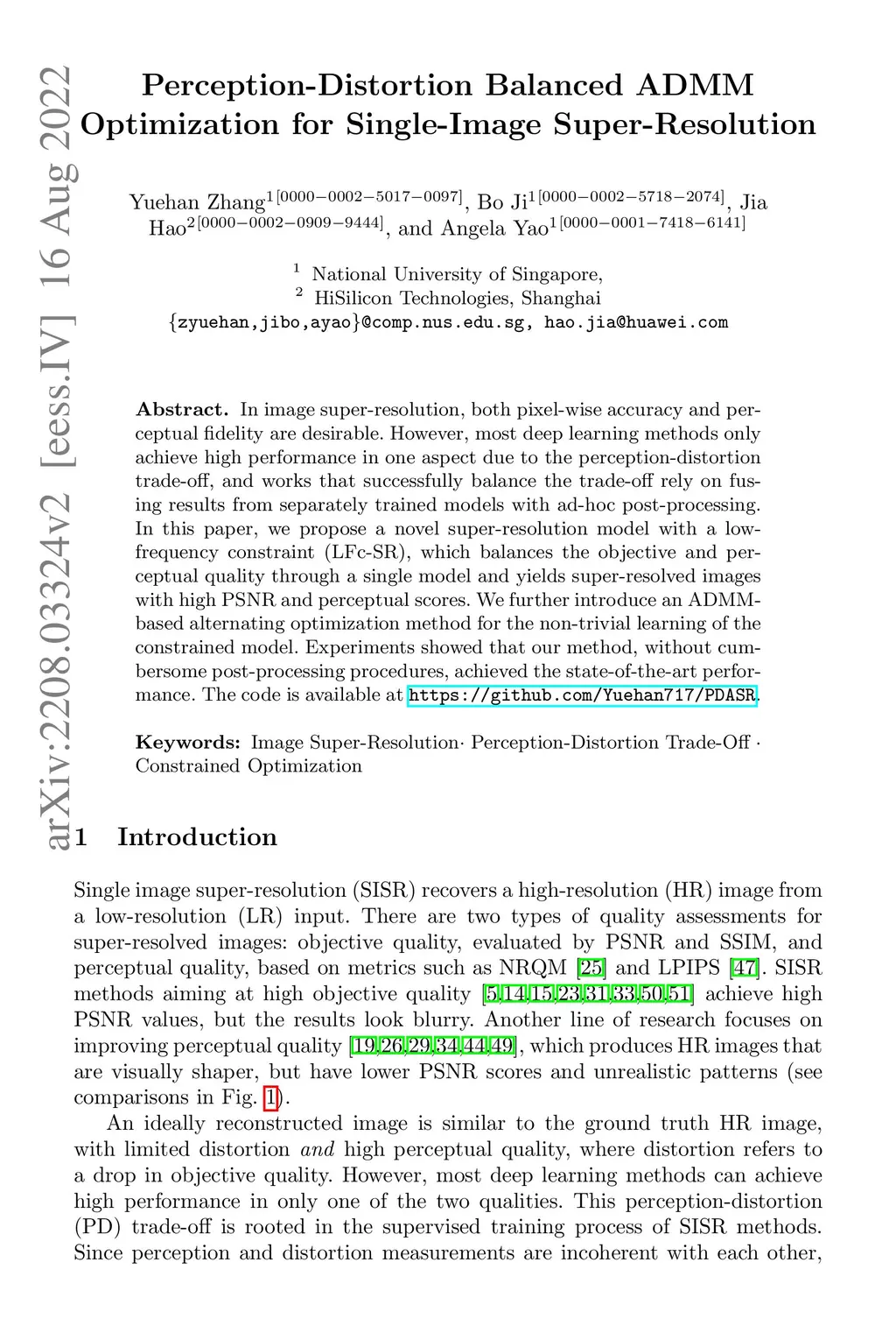 In image super-resolution, both pixel-wise accuracy and perceptual fidelity are desirable. However, most deep learning methods only achieve high performance in one aspect due to the perception-distortion trade-off, and works that successfully balance the trade-off rely on fusing results from separately trained models with ad-hoc post-processing. In this paper, we propose a novel super-resolution model with a low-frequency constraint (LFc-SR), which balances the objective and perceptual quality through a single model and yields super-resolved images with high PSNR and perceptual scores. We further introduce an ADMM-based alternating optimization method for the non-trivial learning of the constrained model. Experiments showed that our method, without cumbersome post-processing procedures, achieved the state-of-the-art performance. The code is available at https://github.com/Yuehan717/PDASR.