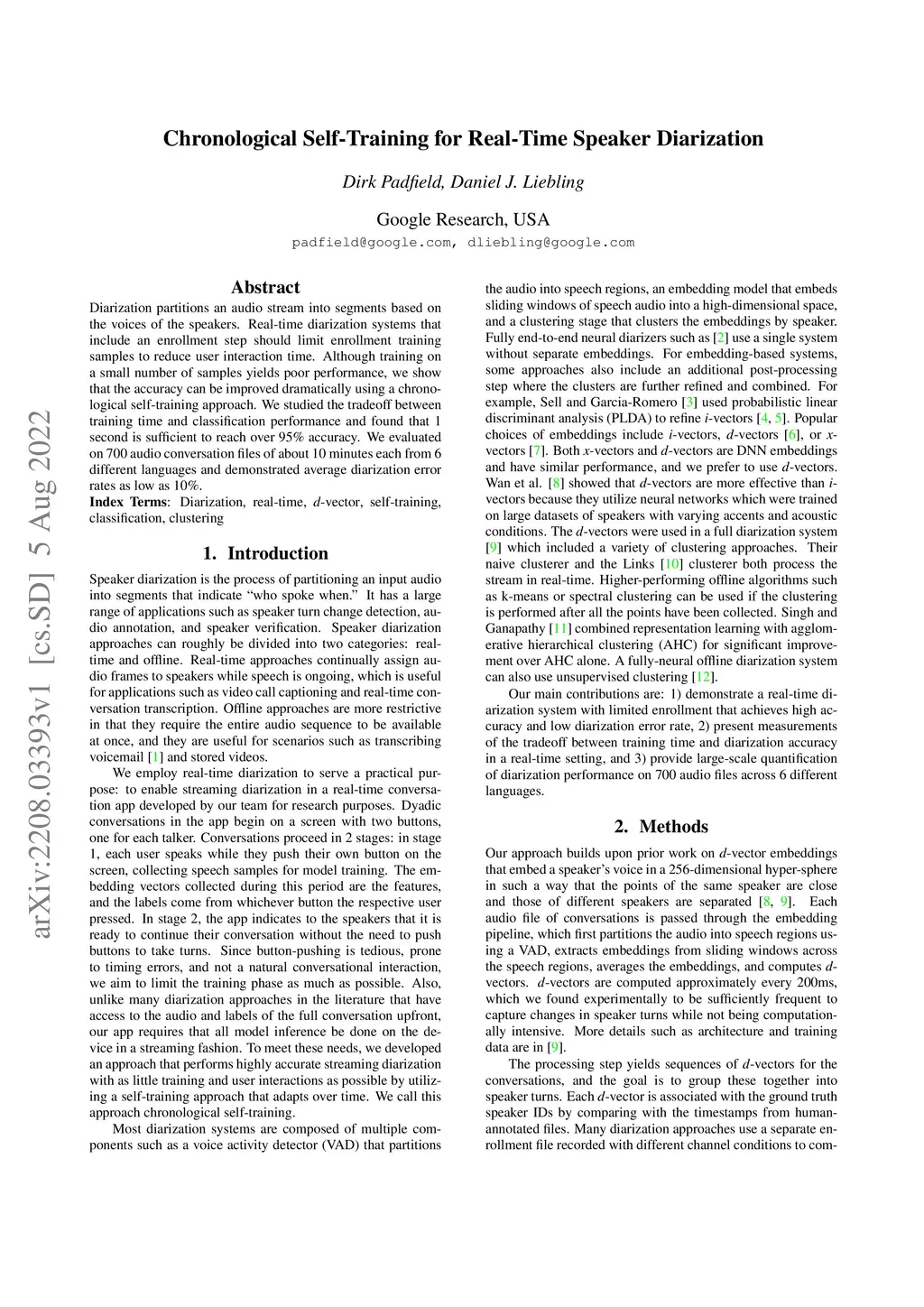 Diarization partitions an audio stream into segments based on the voices of the speakers. Real-time diarization systems that include an enrollment step should limit enrollment training samples to reduce user interaction time. Although training on a small number of samples yields poor performance, we show that the accuracy can be improved dramatically using a chronological self-training approach. We studied the tradeoff between training time and classification performance and found that 1 second is sufficient to reach over 95% accuracy. We evaluated on 700 audio conversation files of about 10 minutes each from 6 different languages and demonstrated average diarization error rates as low as 10%.