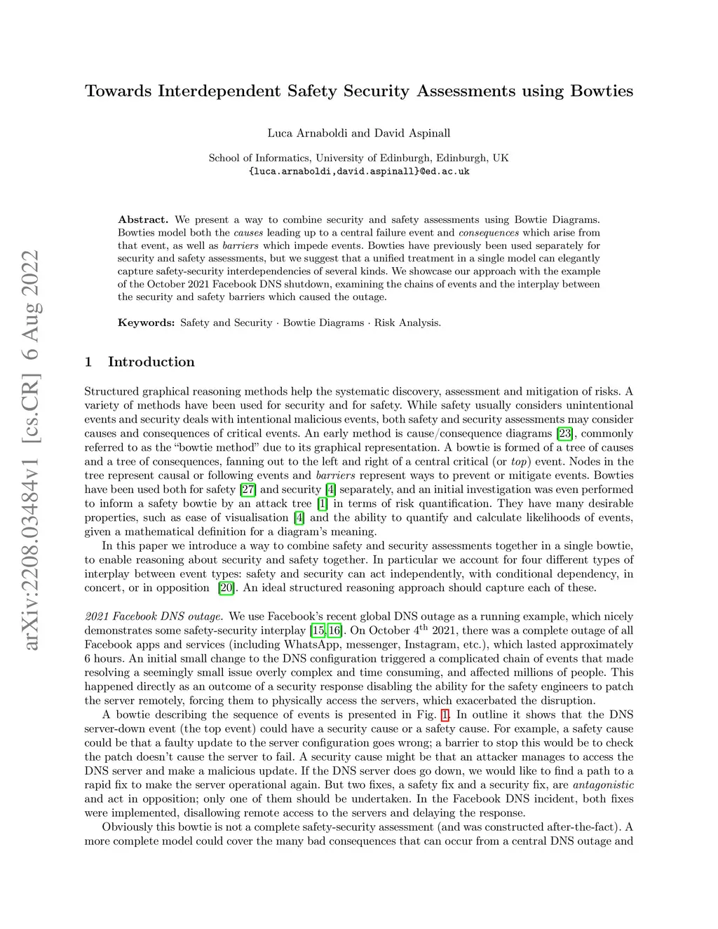We present a way to combine security and safety assessments using Bowtie Diagrams. Bowties model both the causes leading up to a central failure event and consequences which arise from that event, as well as barriers which impede events. Bowties have previously been used separately for security and safety assessments, but we suggest that a unified treatment in a single model can elegantly capture safety-security interdependencies of several kinds. We showcase our approach with the example of the October 2021 Facebook DNS shutdown, examining the chains of events and the interplay between the security and safety barriers which caused the outage.