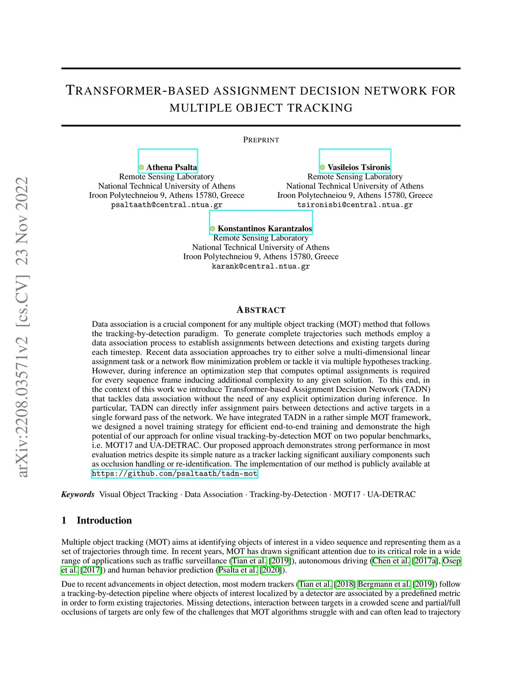 Data association is a crucial component for any multiple object tracking (MOT) method that follows the tracking-by-detection paradigm. To generate complete trajectories such methods employ a data association process to establish assignments between detections and existing targets during each timestep. Recent data association approaches try to solve either a multi-dimensional linear assignment task or a network flow minimization problem or tackle it via multiple hypotheses tracking. However, during inference an optimization step that computes optimal assignments is required for every sequence frame inducing additional complexity to any given solution. To this end, in the context of this work we introduce Transformer-based Assignment Decision Network (TADN) that tackles data association without the need of any explicit optimization during inference. In particular, TADN can directly infer assignment pairs between detections and active targets in a single forward pass of the network. We have integrated TADN in a rather simple MOT framework, designed a novel training strategy for efficient end-to-end training and demonstrated the high potential of our approach for online visual tracking-by-detection MOT on several popular benchmarks, i.e. MOT17, MOT20 and UA-DETRAC. Our proposed approach demonstrates strong performance in most evaluation metrics despite its simple nature as a tracker lacking significant auxiliary components such as occlusion handling or re-identification. The implementation of our method is publicly available atthis https URL.