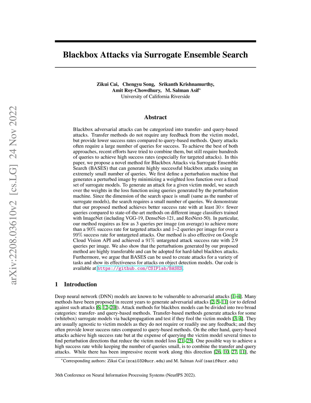 Blackbox adversarial attacks can be categorized into transfer- and query-based attacks. Transfer methods do not require any feedback from the victim model, but provide lower success rates compared to query-based methods. Query attacks often require a large number of queries for success. To achieve the best of both approaches, recent efforts have tried to combine them, but still require hundreds of queries to achieve high success rates (especially for targeted attacks). In this paper, we propose a novel method for Blackbox Attacks via Surrogate Ensemble Search (BASES) that can generate highly successful blackbox attacks using an extremely small number of queries. We first define a perturbation machine that generates a perturbed image by minimizing a weighted loss function over a fixed set of surrogate models. To generate an attack for a given victim model, we search over the weights in the loss function using queries generated by the perturbation machine. Since the dimension of the search space is small (same as the number of surrogate models), the search requires a small number of queries. We demonstrate that our proposed method achieves better success rate with at least 30x fewer queries compared to state-of-the-art methods on different image classifiers trained with ImageNet. In particular, our method requires as few as 3 queries per image (on average) to achieve more than a 90% success rate for targeted attacks and 1-2 queries per image for over a 99% success rate for untargeted attacks. Our method is also effective on Google Cloud Vision API and achieved a 91% untargeted attack success rate with 2.9 queries per image. We also show that the perturbations generated by our proposed method are highly transferable and can be adopted for hard-label blackbox attacks. We also show effectiveness of BASES for hiding attacks on object detectors.