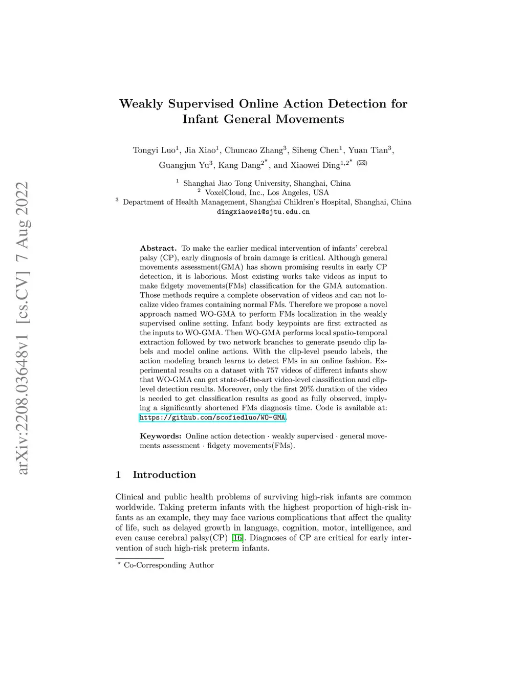 To make the earlier medical intervention of infants' cerebral palsy (CP), early diagnosis of brain damage is critical. Although general movements assessment(GMA) has shown promising results in early CP detection, it is laborious. Most existing works take videos as input to make fidgety movements(FMs) classification for the GMA automation. Those methods require a complete observation of videos and can not localize video frames containing normal FMs. Therefore we propose a novel approach named WO-GMA to perform FMs localization in the weakly supervised online setting. Infant body keypoints are first extracted as the inputs to WO-GMA. Then WO-GMA performs local spatio-temporal extraction followed by two network branches to generate pseudo clip labels and model online actions. With the clip-level pseudo labels, the action modeling branch learns to detect FMs in an online fashion. Experimental results on a dataset with 757 videos of different infants show that WO-GMA can get state-of-the-art video-level classification and cliplevel detection results. Moreover, only the first 20% duration of the video is needed to get classification results as good as fully observed, implying a significantly shortened FMs diagnosis time. Code is available at: https://github.com/scofiedluo/WO-GMA.