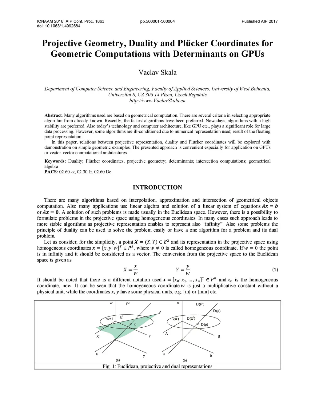 Many algorithms used are based on geometrical computation. There are several criteria in selecting appropriate algorithm from already known. Recently, the fastest algorithms have been preferred. Nowadays, algorithms with a high stability are preferred. Also technology and computer architecture, like GPU etc., plays a significant role for large data processing. However, some algorithms are ill-conditioned due to numerical representation used; result of the floating point representation. In this paper, relations between projective representation, duality and Plucker coordinates will be explored with demonstration on simple geometric examples. The presented approach is convenient especially for application on GPUs or vector-vector computational architectures