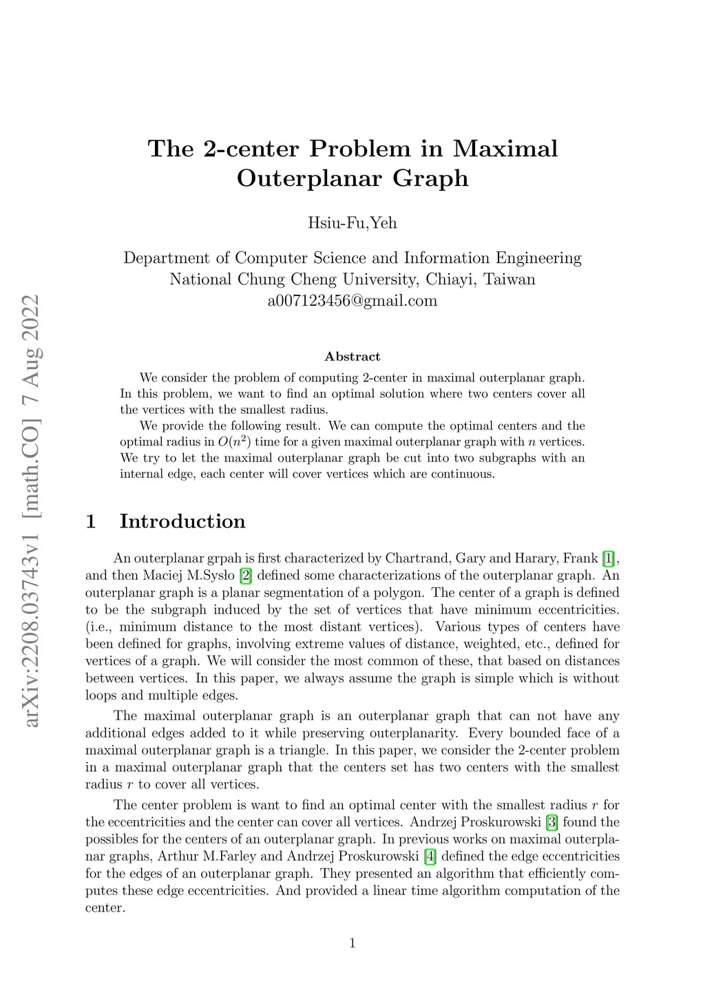 We consider the problem of computing 2-center in maximal outerplanar graph. In this problem, we want to find an optimal solution where two centers cover all the vertices with the smallest radius. We provide the following result. We can compute the optimal centers and the optimal radius in time for a given maximal outerplanar graph with vertices. We try to let the maximal outerplanar graph be cut into two subgraphs with an internal edge, each center will cover vertices which are continuous.