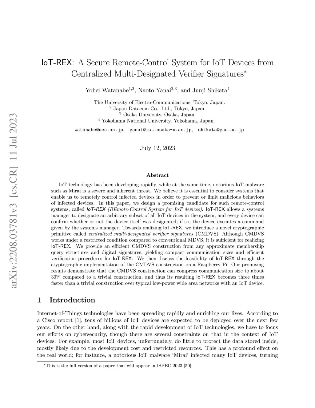 IoT technology has been developing rapidly, while at the same time, notorious IoT malware such as Mirai is a severe and inherent threat. We believe it is essential to consider systems that enable us to remotely control infected devices in order to prevent or limit malicious behaviors of infected devices. In this paper, we design a promising candidate for such remote-control systems, called IoT-REX (REmote-Control System for IoT devices). IoT-REX allows a systems manager to designate an arbitrary subset of all IoT devices in the system, and every device can confirm whether or not the device itself was designated; if so, the device executes a command given by the systems manager. Towards realizing IoT-REX, we introduce a novel cryptographic primitive called centralized multi-designated verifier signatures (CMDVS). Although CMDVS works under a restricted condition compared to conventional MDVS, it is sufficient for realizing IoT-REX. We provide an efficient CMDVS construction from any approximate membership query structures and digital signatures, yielding compact communication sizes and efficient verification procedures for IoT-REX. We then discuss the feasibility of IoT-REX through the cryptographic implementation of the CMDVS construction on a Raspberry Pi. Our promising results demonstrate that the CMDVS construction can compress communication size to about 30% compared to a trivial construction, and thus its resulting IoT-REX becomes three times faster than a trivial construction over typical low-power wide area networks with an IoT device.