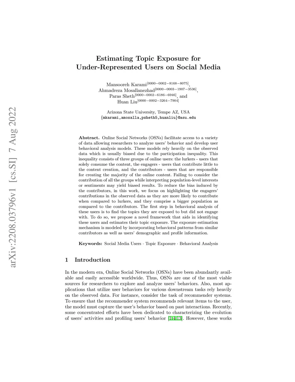 Online Social Networks (OSNs) facilitate access to a variety of data allowing researchers to analyze users' behavior and develop user behavioral analysis models. These models rely heavily on the observed data which is usually biased due to the participation inequality. This inequality consists of three groups of online users: the lurkers - users that solely consume the content, the engagers - users that contribute little to the content creation, and the contributors - users that are responsible for creating the majority of the online content. Failing to consider the contribution of all the groups while interpreting population-level interests or sentiments may yield biased results. To reduce the bias induced by the contributors, in this work, we focus on highlighting the engagers' contributions in the observed data as they are more likely to contribute when compared to lurkers, and they comprise a bigger population as compared to the contributors. The first step in behavioral analysis of these users is to find the topics they are exposed to but did not engage with. To do so, we propose a novel framework that aids in identifying these users and estimates their topic exposure. The exposure estimation mechanism is modeled by incorporating behavioral patterns from similar contributors as well as users' demographic and profile information.