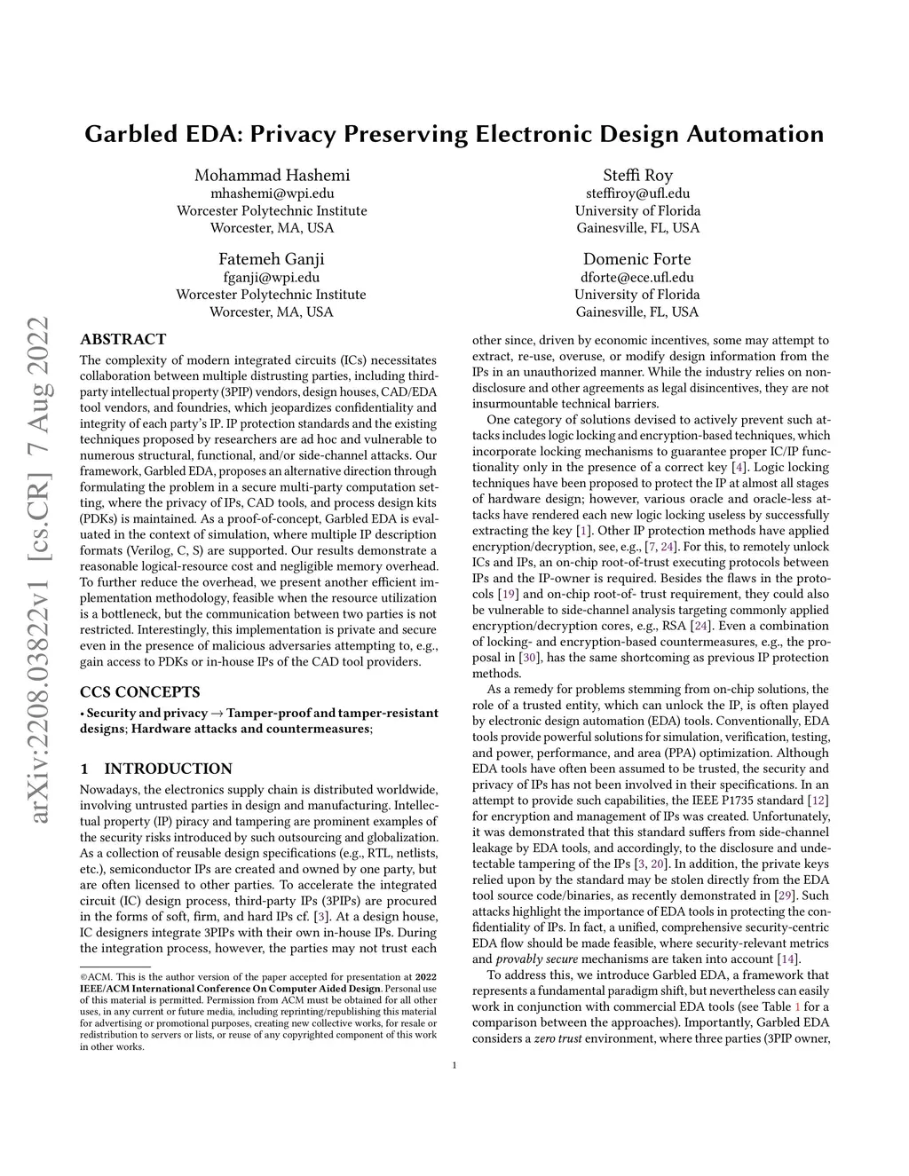 Garbled EDA: Privacy Preserving Electronic Design Automation