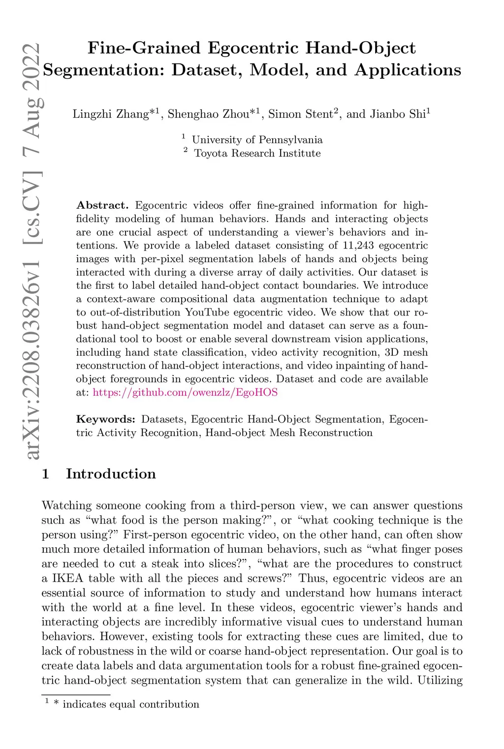 Egocentric videos offer fine-grained information for high-fidelity modeling of human behaviors. Hands and interacting objects are one crucial aspect of understanding a viewer's behaviors and intentions. We provide a labeled dataset consisting of 11,243 egocentric images with per-pixel segmentation labels of hands and objects being interacted with during a diverse array of daily activities. Our dataset is the first to label detailed hand-object contact boundaries. We introduce a context-aware compositional data augmentation technique to adapt to out-of-distribution YouTube egocentric video. We show that our robust hand-object segmentation model and dataset can serve as a foundational tool to boost or enable several downstream vision applications, including hand state classification, video activity recognition, 3D mesh reconstruction of hand-object interactions, and video inpainting of hand-object foregrounds in egocentric videos. Dataset and code are available at: https://github.com/owenzlz/EgoHOS