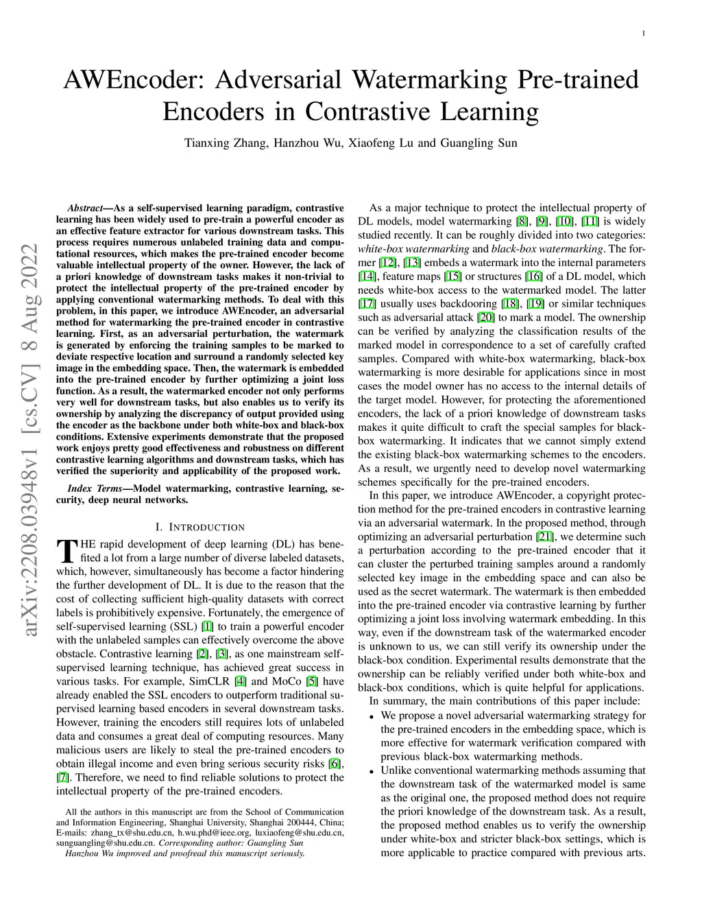 AWEncoder: Adversarial Watermarking Pre-trained Encoders in Contrastive
