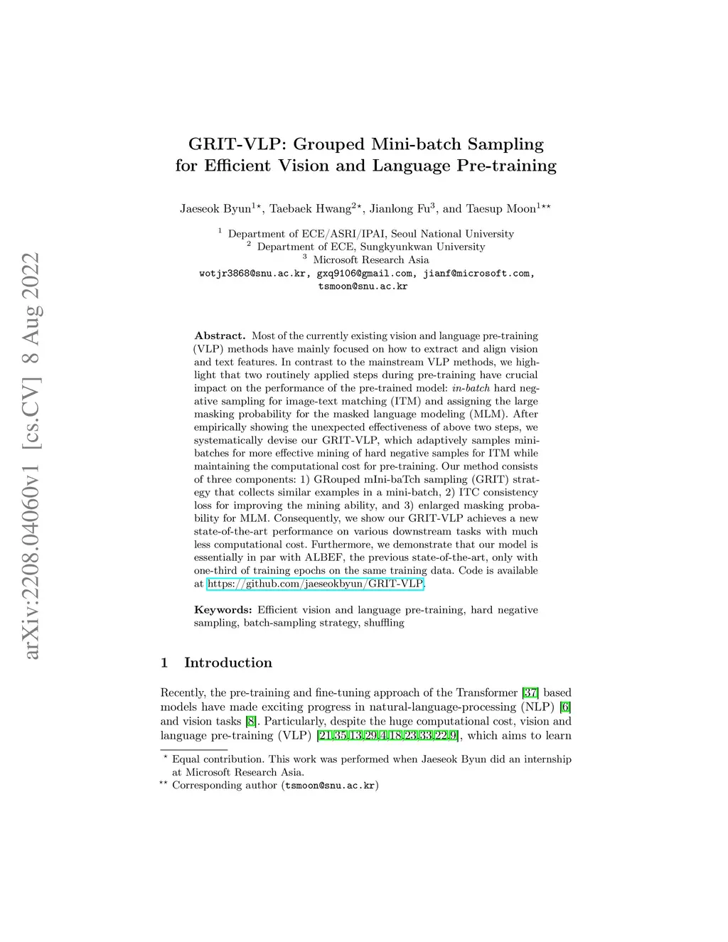 GRIT-VLP: Grouped Mini-batch Sampling for Efficient Vision and Language