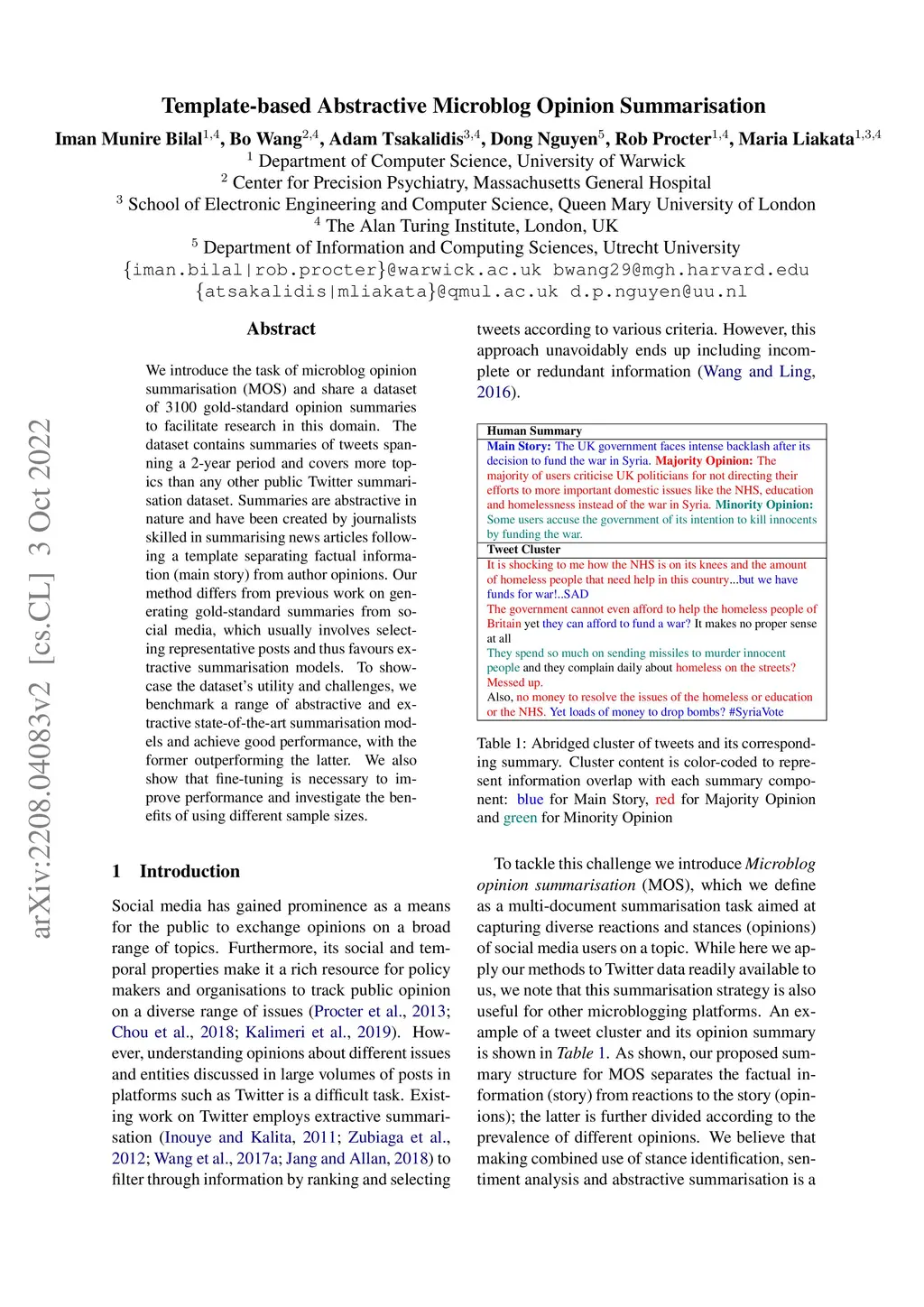 We introduce the task of microblog opinion summarisation (MOS) and share a dataset of 3100 gold-standard opinion summaries to facilitate research in this domain. The dataset contains summaries of tweets spanning a 2-year period and covers more topics than any other public Twitter summarisation dataset. Summaries are abstractive in nature and have been created by journalists skilled in summarising news articles following a template separating factual information (main story) from author opinions. Our method differs from previous work on generating gold-standard summaries from social media, which usually involves selecting representative posts and thus favours extractive summarisation models. To showcase the dataset's utility and challenges, we benchmark a range of abstractive and extractive state-of-the-art summarisation models and achieve good performance, with the former outperforming the latter. We also show that fine-tuning is necessary to improve performance and investigate the benefits of using different sample sizes.