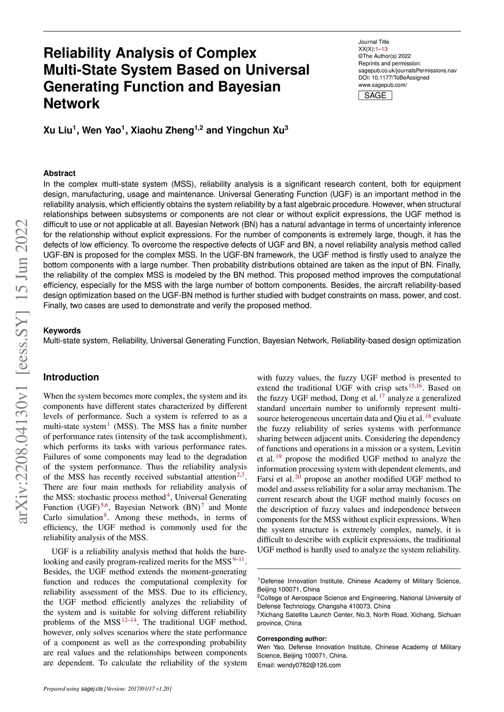 In the complex multi-state system (MSS), reliability analysis is a significant research content, both for equipment design, manufacturing, usage and maintenance. Universal Generating Function (UGF) is an important method in the reliability analysis, which efficiently obtains the system reliability by a fast algebraic procedure. However, when structural relationships between subsystems or components are not clear or without explicit expressions, the UGF method is difficult to use or not applicable at all. Bayesian Network (BN) has a natural advantage in terms of uncertainty inference for the relationship without explicit expressions. For the number of components is extremely large, though, it has the defects of low efficiency. To overcome the respective defects of UGF and BN, a novel reliability analysis method called UGF-BN is proposed for the complex MSS. In the UGF-BN framework, the UGF method is firstly used to analyze the bottom components with a large number. Then probability distributions obtained are taken as the input of BN. Finally, the reliability of the complex MSS is modeled by the BN method. This proposed method improves the computational efficiency, especially for the MSS with the large number of bottom components. Besides, the aircraft reliability-based design optimization based on the UGF-BN method is further studied with budget constraints on mass, power, and cost. Finally, two cases are used to demonstrate and verify the proposed method.
