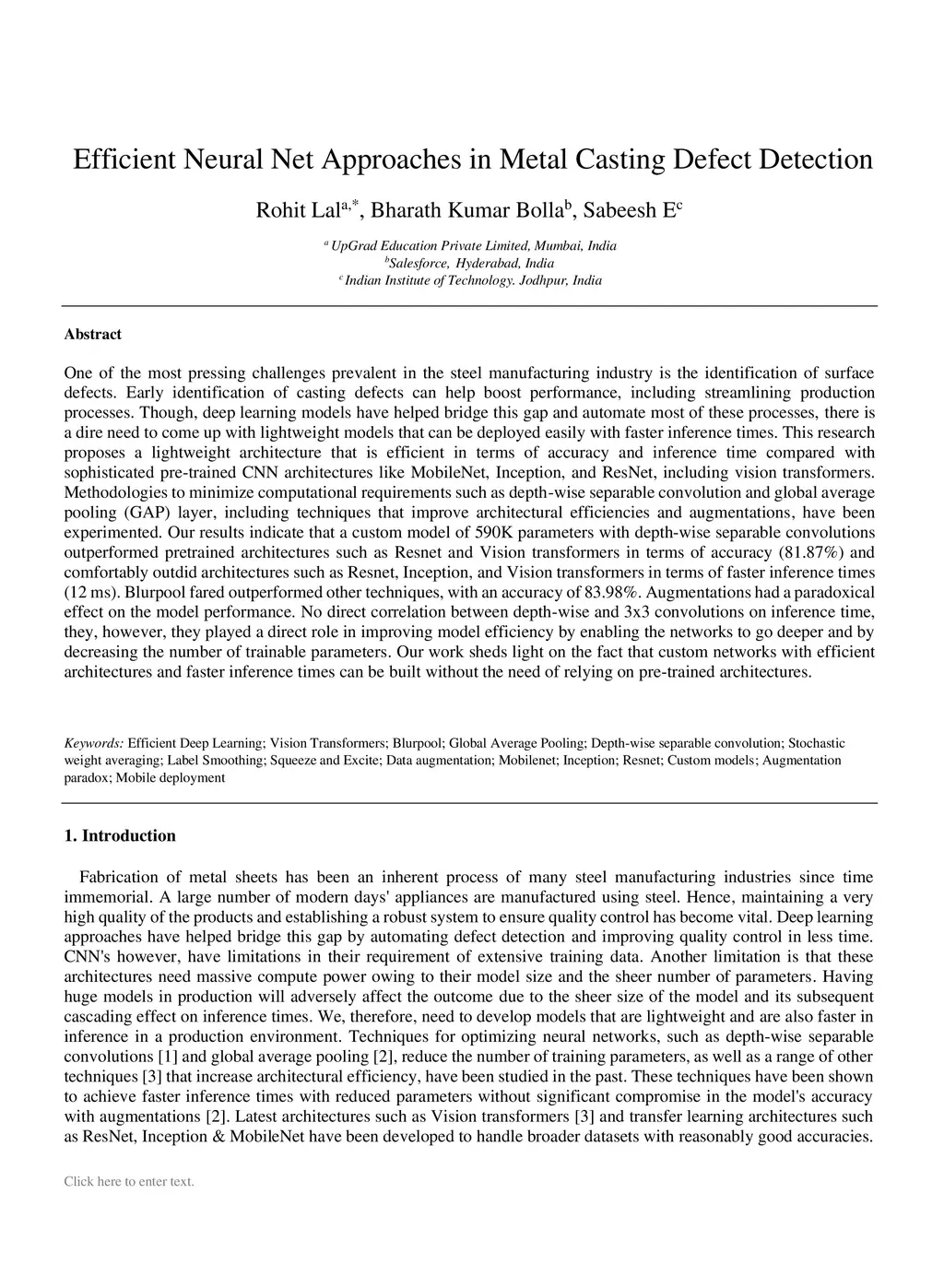 One of the most pressing challenges prevalent in the steel manufacturing industry is the identification of surface defects. Early identification of casting defects can help boost performance, including streamlining production processes. Though, deep learning models have helped bridge this gap and automate most of these processes, there is a dire need to come up with lightweight models that can be deployed easily with faster inference times. This research proposes a lightweight architecture that is efficient in terms of accuracy and inference time compared with sophisticated pre-trained CNN architectures like MobileNet, Inception, and ResNet, including vision transformers. Methodologies to minimize computational requirements such as depth-wise separable convolution and global average pooling (GAP) layer, including techniques that improve architectural efficiencies and augmentations, have been experimented. Our results indicate that a custom model of 590K parameters with depth-wise separable convolutions outperformed pretrained architectures such as Resnet and Vision transformers in terms of accuracy (81.87%) and comfortably outdid architectures such as Resnet, Inception, and Vision transformers in terms of faster inference times (12 ms). Blurpool fared outperformed other techniques, with an accuracy of 83.98%. Augmentations had a paradoxical effect on the model performance. No direct correlation between depth-wise and 3x3 convolutions on inference time, they, however, they played a direct role in improving model efficiency by enabling the networks to go deeper and by decreasing the number of trainable parameters. Our work sheds light on the fact that custom networks with efficient architectures and faster inference times can be built without the need of relying on pre-trained architectures.