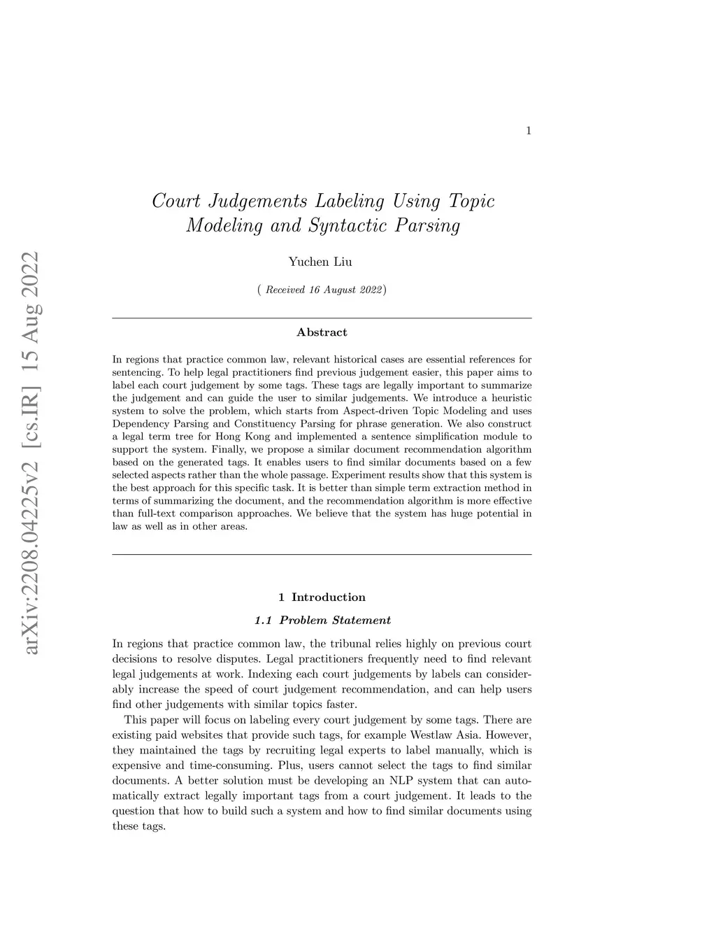 In regions that practice common law, relevant historical cases are essential references for sentencing. To help legal practitioners find previous judgement easier, this paper aims to label each court judgement by some tags. These tags are legally important to summarize the judgement and can guide the user to similar judgements. We introduce a heuristic system to solve the problem, which starts from Aspect-driven Topic Modeling and uses Dependency Parsing and Constituency Parsing for phrase generation. We also construct a legal term tree for Hong Kong and implemented a sentence simplification module to support the system. Finally, we propose a similar document recommendation algorithm based on the generated tags. It enables users to find similar documents based on a few selected aspects rather than the whole passage. Experiment results show that this system is the best approach for this specific task. It is better than simple term extraction method in terms of summarizing the document, and the recommendation algorithm is more effective than full-text comparison approaches. We believe that the system has huge potential in law as well as in other areas.