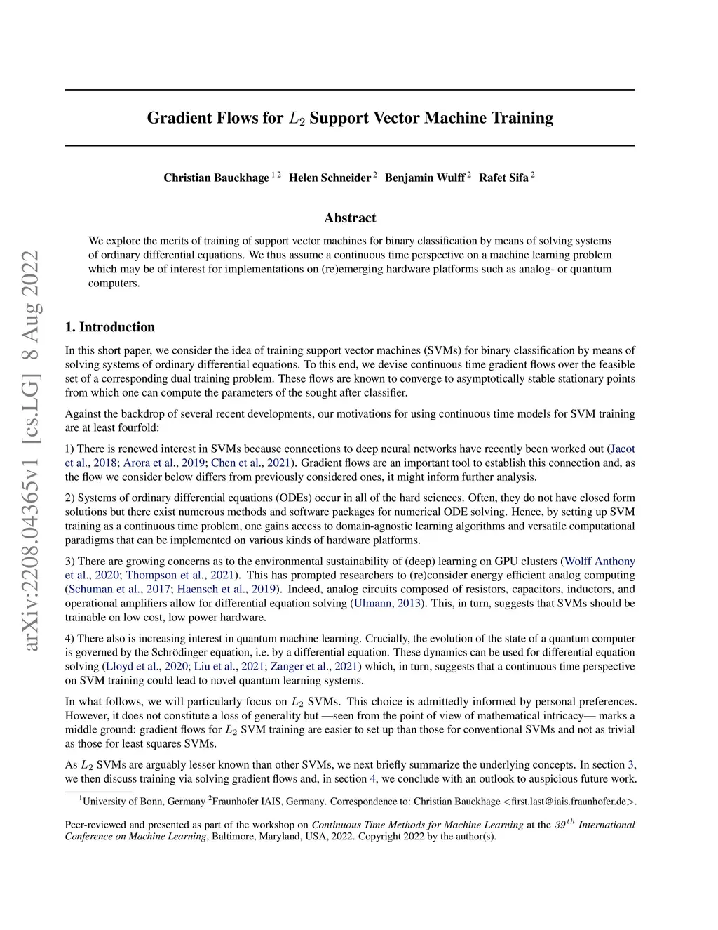 We explore the merits of training of support vector machines for binary classification by means of solving systems of ordinary differential equations. We thus assume a continuous time perspective on a machine learning problem which may be of interest for implementations on (re)emerging hardware platforms such as analog- or quantum computers.