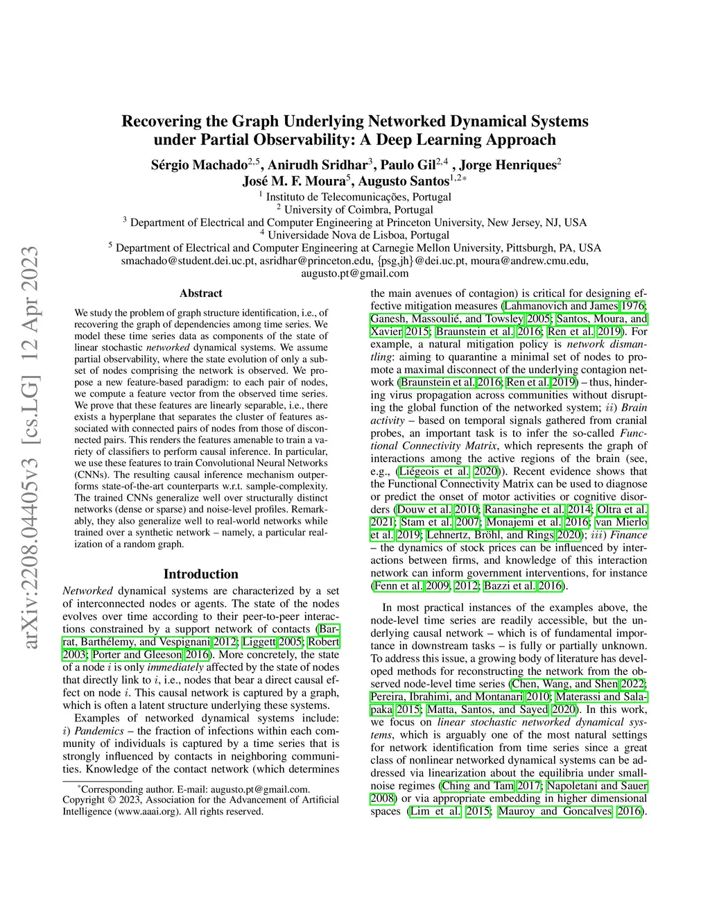 We study the problem of graph structure identification, i.e., of recovering the graph of dependencies among time series. We model these time series data as components of the state of linear stochastic networked dynamical systems. We assume partial observability, where the state evolution of only a subset of nodes comprising the network is observed. We devise a new feature vector computed from the observed time series and prove that these features are linearly separable, i.e., there exists a hyperplane that separates the cluster of features associated with connected pairs of nodes from those associated with disconnected pairs. This renders the features amenable to train a variety of classifiers to perform causal inference. In particular, we use these features to train Convolutional Neural Networks (CNNs). The resulting causal inference mechanism outperforms state-of-the-art counterparts w.r.t. sample-complexity. The trained CNNs generalize well over structurally distinct networks (dense or sparse) and noise-level profiles. Remarkably, they also generalize well to real-world networks while trained over a synthetic network (realization of a random graph). Finally, the proposed method consistently reconstructs the graph in a pairwise manner, that is, by deciding if an edge or arrow is present or absent in each pair of nodes, from the corresponding time series of each pair. This fits the framework of large-scale systems, where observation or processing of all nodes in the network is prohibitive.