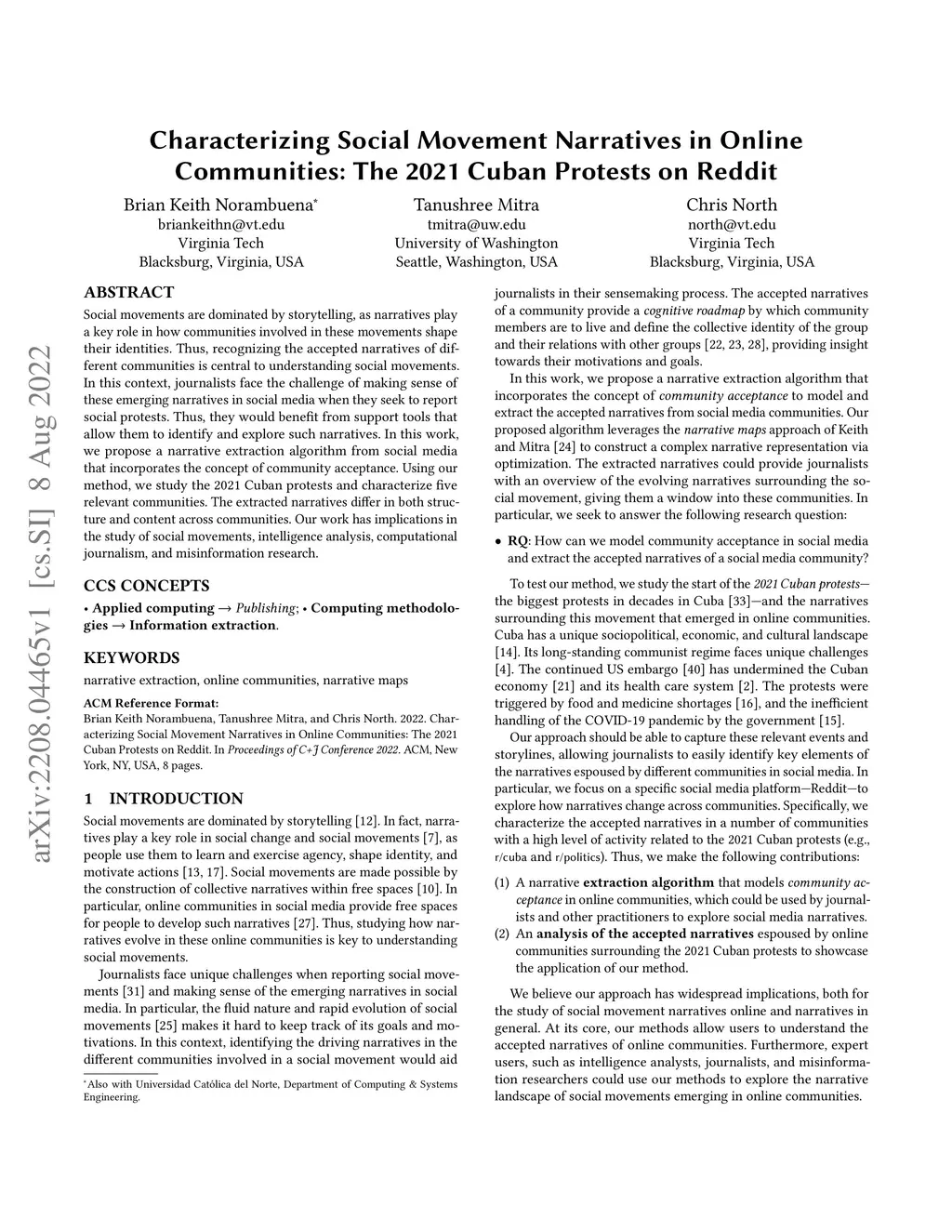 Social movements are dominated by storytelling, as narratives play a key role in how communities involved in these movements shape their identities. Thus, recognizing the accepted narratives of different communities is central to understanding social movements. In this context, journalists face the challenge of making sense of these emerging narratives in social media when they seek to report social protests. Thus, they would benefit from support tools that allow them to identify and explore such narratives. In this work, we propose a narrative extraction algorithm from social media that incorporates the concept of community acceptance. Using our method, we study the 2021 Cuban protests and characterize five relevant communities. The extracted narratives differ in both structure and content across communities. Our work has implications in the study of social movements, intelligence analysis, computational journalism, and misinformation research.