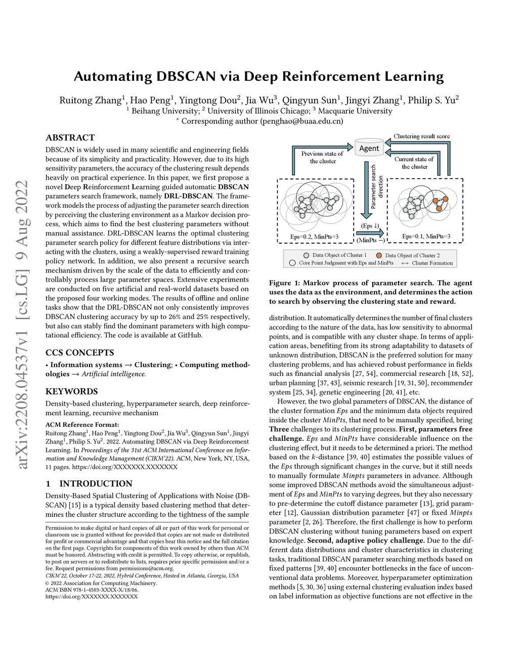 Automating DBSCAN via Deep Reinforcement Learning