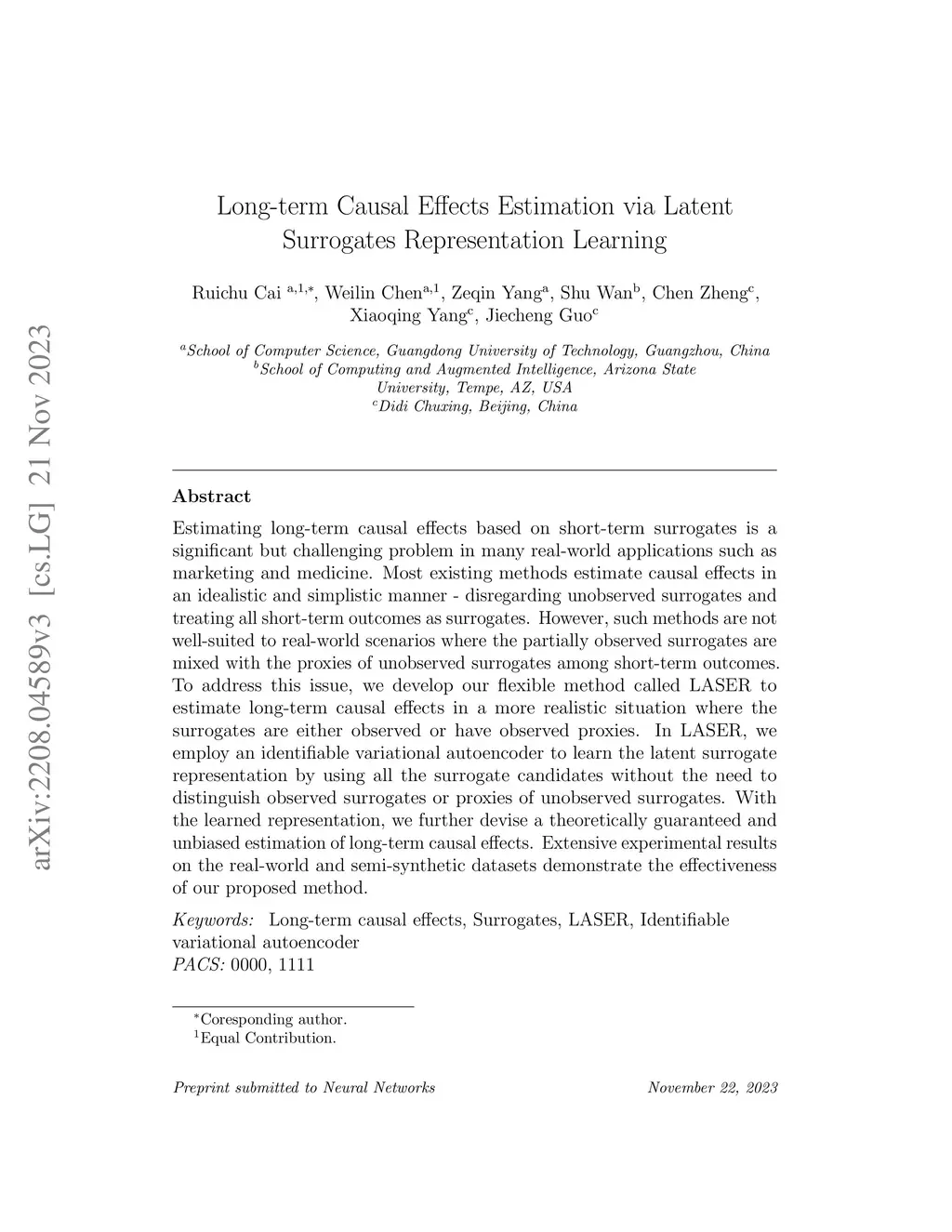 Estimating long-term causal effects based on short-term surrogates is a significant but challenging problem in many real-world applications, e.g., marketing and medicine. Despite its success in certain domains, most existing methods estimate causal effects in an idealistic and simplistic way - ignoring the causal structure among short-term outcomes and treating all of them as surrogates. However, such methods cannot be well applied to real-world scenarios, in which the partially observed surrogates are mixed with their proxies among short-term outcomes. To this end, we develop our flexible method, Laser, to estimate long-term causal effects in the more realistic situation that the surrogates are observed or have observed proxies.Given the indistinguishability between the surrogates and proxies, we utilize identifiable variational auto-encoder (iVAE) to recover the whole valid surrogates on all the surrogates candidates without the need of distinguishing the observed surrogates or the proxies of latent surrogates. With the help of the recovered surrogates, we further devise an unbiased estimation of long-term causal effects. Extensive experimental results on the real-world and semi-synthetic datasets demonstrate the effectiveness of our proposed method.