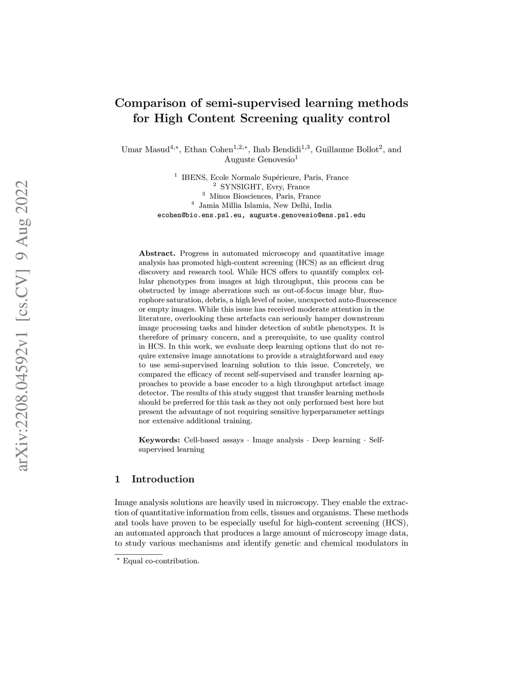 Progress in automated microscopy and quantitative image analysis has promoted high-content screening (HCS) as an efficient drug discovery and research tool. While HCS offers to quantify complex cellular phenotypes from images at high throughput, this process can be obstructed by image aberrations such as out-of-focus image blur, fluorophore saturation, debris, a high level of noise, unexpected auto-fluorescence or empty images. While this issue has received moderate attention in the literature, overlooking these artefacts can seriously hamper downstream image processing tasks and hinder detection of subtle phenotypes. It is therefore of primary concern, and a prerequisite, to use quality control in HCS. In this work, we evaluate deep learning options that do not require extensive image annotations to provide a straightforward and easy to use semi-supervised learning solution to this issue. Concretely, we compared the efficacy of recent self-supervised and transfer learning approaches to provide a base encoder to a high throughput artefact image detector. The results of this study suggest that transfer learning methods should be preferred for this task as they not only performed best here but present the advantage of not requiring sensitive hyperparameter settings nor extensive additional training.