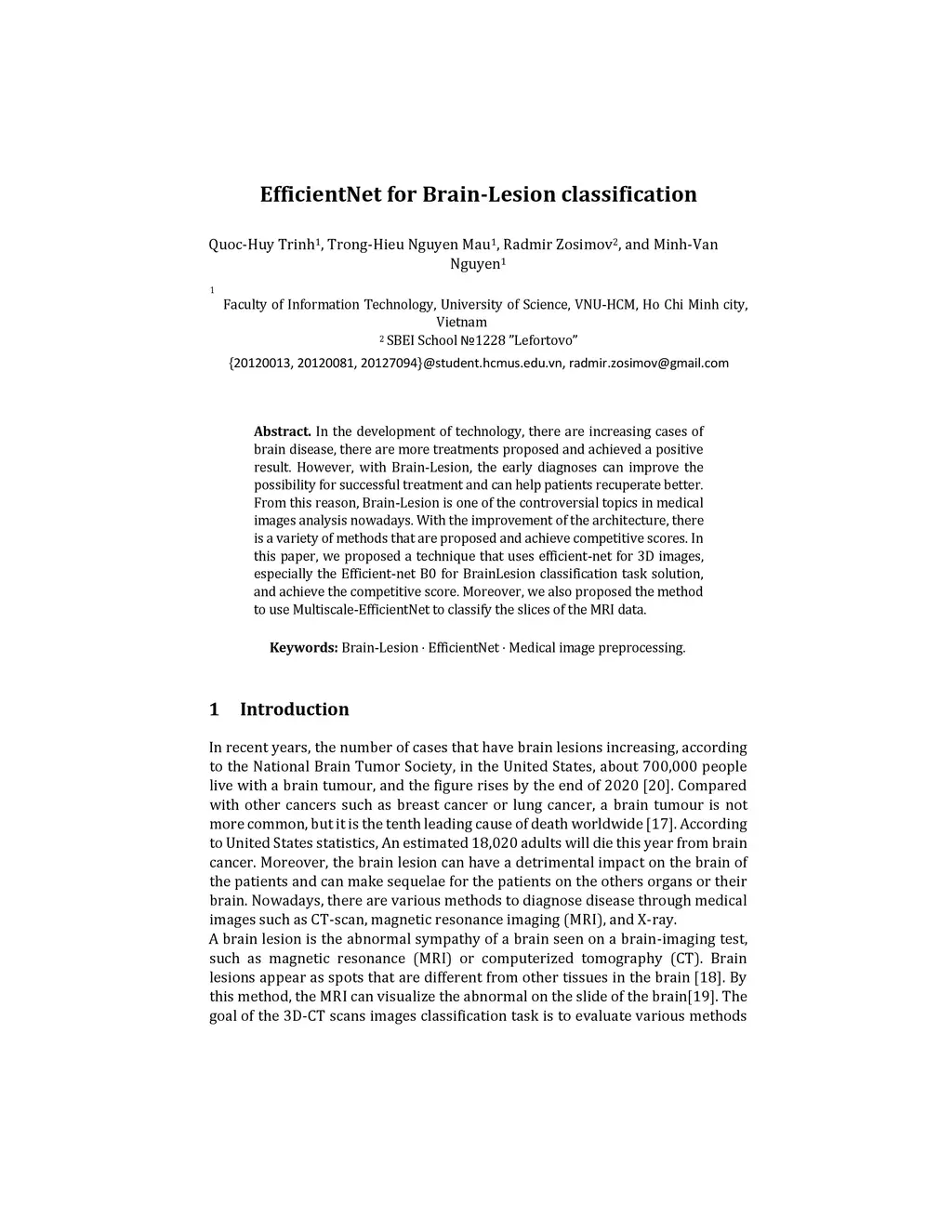 In the development of technology, there are increasing cases of brain disease, there are more treatments proposed and achieved a positive result. However, with Brain-Lesion, the early diagnoses can improve the possibility for successful treatment and can help patients recuperate better. From this reason, Brain-Lesion is one of the controversial topics in medical images analysis nowadays. With the improvement of the architecture, there is a variety of methods that are proposed and achieve competitive scores. In this paper, we proposed a technique that uses efficient-net for 3D images, especially the Efficient-net B0 for Brain-Lesion classification task solution, and achieve the competitive score. Moreover, we also proposed the method to use Multiscale-EfficientNet to classify the slices of the MRI data