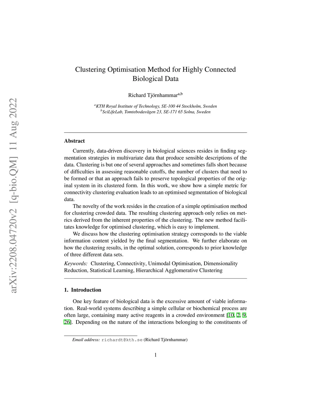 Currently, data-driven discovery in biological sciences resides in finding segmentation strategies in multivariate data that produce sensible descriptions of the data. Clustering is but one of several approaches and sometimes falls short because of difficulties in assessing reasonable cutoffs, the number of clusters that need to be formed or that an approach fails to preserve topological properties of the original system in its clustered form. In this work, we show how a simple metric for connectivity clustering evaluation leads to an optimised segmentation of biological data. The novelty of the work resides in the creation of a simple optimisation method for clustering crowded data. The resulting clustering approach only relies on metrics derived from the inherent properties of the clustering. The new method facilitates knowledge for optimised clustering, which is easy to implement. We discuss how the clustering optimisation strategy corresponds to the viable information content yielded by the final segmentation. We further elaborate on how the clustering results, in the optimal solution, corresponds to prior knowledge of three different data sets.