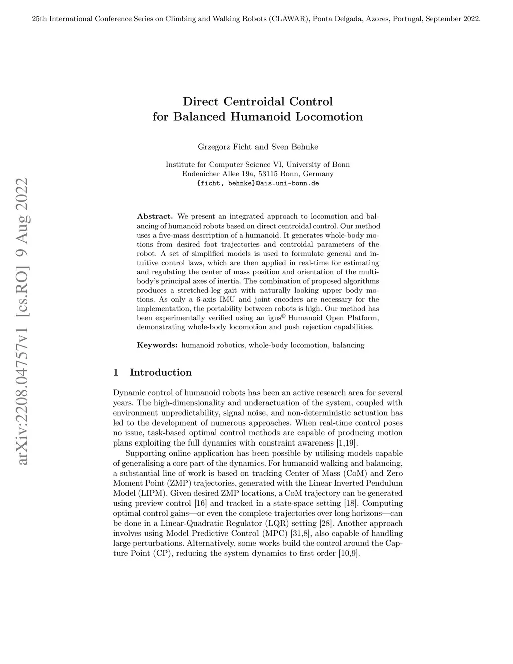 We present an integrated approach to locomotion and balancing of humanoid robots based on direct centroidal control. Our method uses a five-mass description of a humanoid. It generates whole-body motions from desired foot trajectories and centroidal parameters of the robot. A set of simplified models is used to formulate general and intuitive control laws, which are then applied in real-time for estimating and regulating the center of mass position and orientation of the multibody's principal axes of inertia. The combination of proposed algorithms produces a stretched-leg gait with naturally looking upper body motions. As only a 6-axis IMU and joint encoders are necessary for the implementation, the portability between robots is high. Our method has been experimentally verified using an igus Humanoid Open Platform, demonstrating whole-body locomotion and push rejection capabilities.