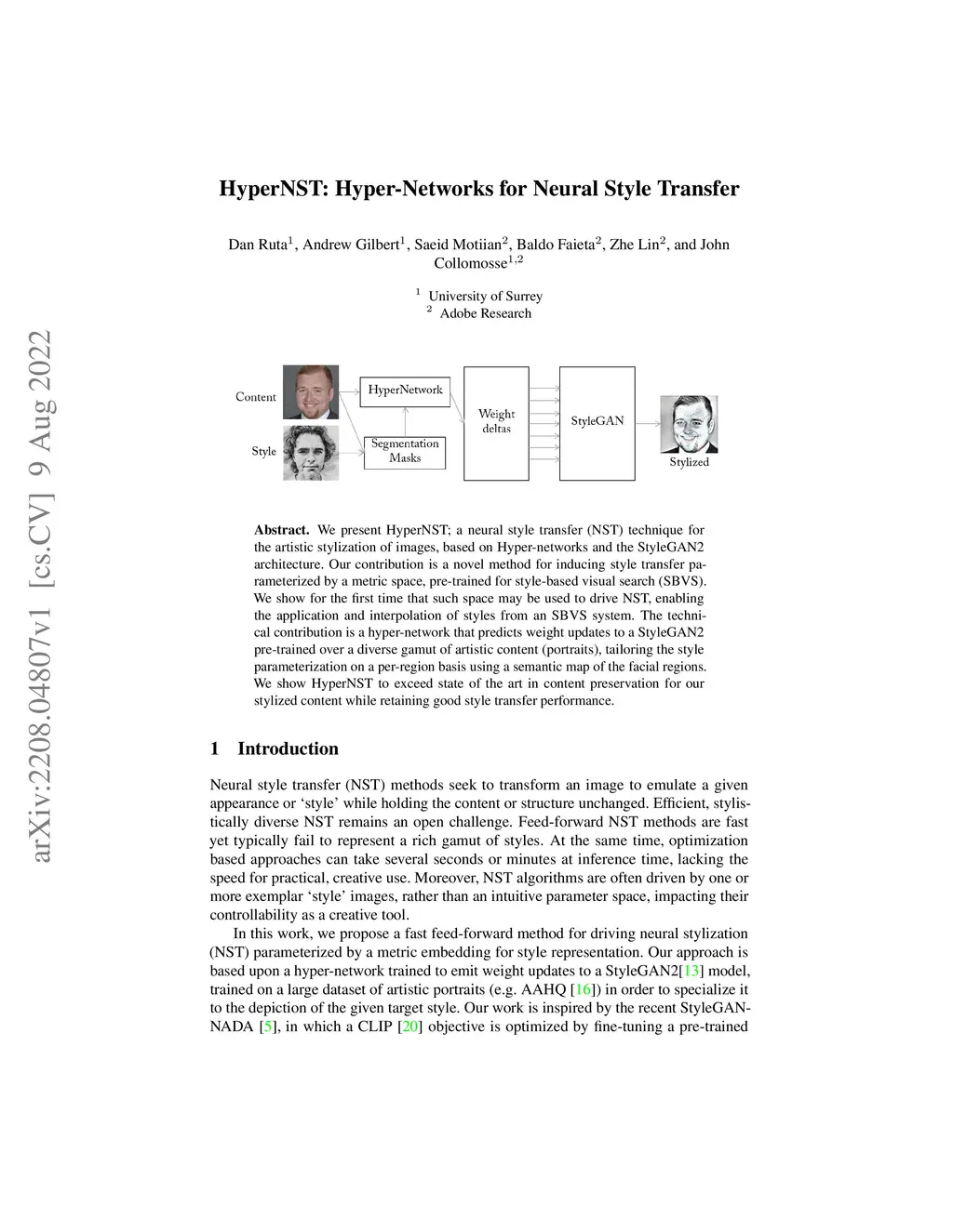 We present HyperNST; a neural style transfer (NST) technique for the artistic stylization of images, based on Hyper-networks and the StyleGAN2 architecture. Our contribution is a novel method for inducing style transfer parameterized by a metric space, pre-trained for style-based visual search (SBVS). We show for the first time that such space may be used to drive NST, enabling the application and interpolation of styles from an SBVS system. The technical contribution is a hyper-network that predicts weight updates to a StyleGAN2 pre-trained over a diverse gamut of artistic content (portraits), tailoring the style parameterization on a per-region basis using a semantic map of the facial regions. We show HyperNST to exceed state of the art in content preservation for our stylized content while retaining good style transfer performance.