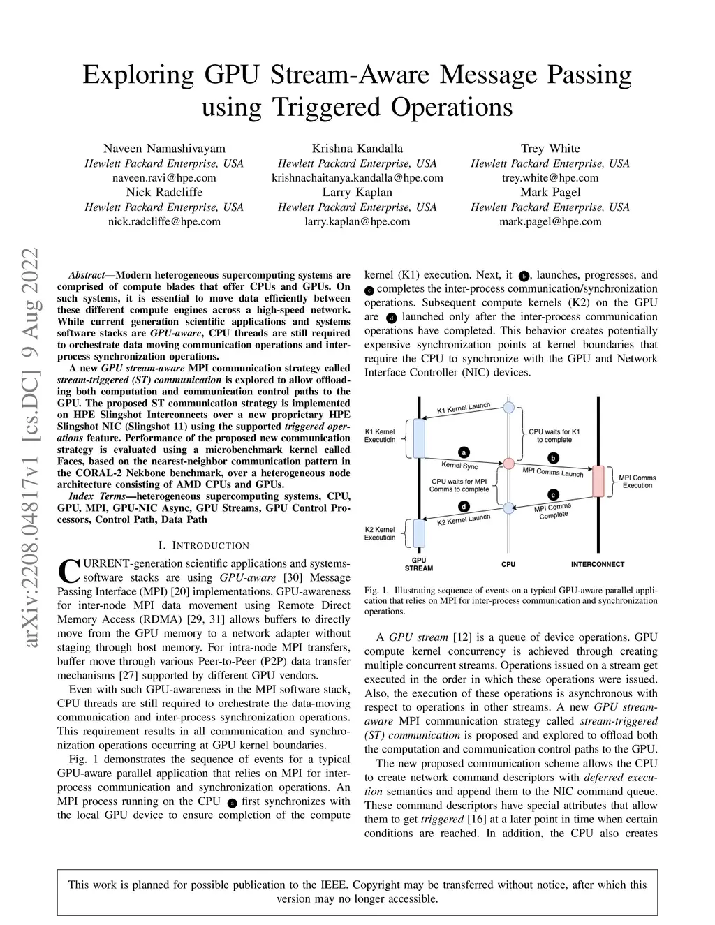 Modern heterogeneous supercomputing systems are comprised of compute blades that offer CPUs and GPUs. On such systems, it is essential to move data efficiently between these different compute engines across a high-speed network. While current generation scientific applications and systems software stacks are GPU-aware, CPU threads are still required to orchestrate data moving communication operations and inter-process synchronization operations. A new GPU stream-aware MPI communication strategy called stream-triggered (ST) communication is explored to allow offloading both computation and communication control paths to the GPU. The proposed ST communication strategy is implemented on HPE Slingshot Interconnects over a new proprietary HPE Slingshot NIC (Slingshot 11) using the supported triggered operations feature. Performance of the proposed new communication strategy is evaluated using a microbenchmark kernel called Faces, based on the nearest-neighbor communication pattern in the CORAL-2 Nekbone benchmark, over a heterogeneous node architecture consisting of AMD CPUs and GPUs.