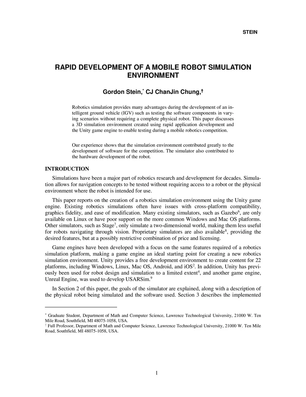 Robotics simulation provides many advantages during the development of an intelligent ground vehicle (IGV) such as testing the software components in varying scenarios without requiring a complete physical robot. This paper discusses a 3D simulation environment created using rapid application development and the Unity game engine to enable testing during a mobile robotics competition. Our experience shows that the simulation environment contributed greatly to the development of software for the competition. The simulator also contributed to the hardware development of the robot.