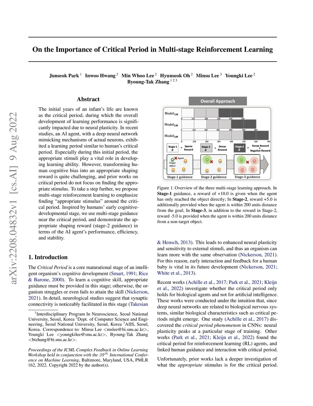 The initial years of an infant's life are known as the critical period, during which the overall development of learning performance is significantly impacted due to neural plasticity. In recent studies, an AI agent, with a deep neural network mimicking mechanisms of actual neurons, exhibited a learning period similar to human's critical period. Especially during this initial period, the appropriate stimuli play a vital role in developing learning ability. However, transforming human cognitive bias into an appropriate shaping reward is quite challenging, and prior works on critical period do not focus on finding the appropriate stimulus. To take a step further, we propose multi-stage reinforcement learning to emphasize finding ``appropriate stimulus" around the critical period. Inspired by humans' early cognitive-developmental stage, we use multi-stage guidance near the critical period, and demonstrate the appropriate shaping reward (stage-2 guidance) in terms of the AI agent's performance, efficiency, and stability.