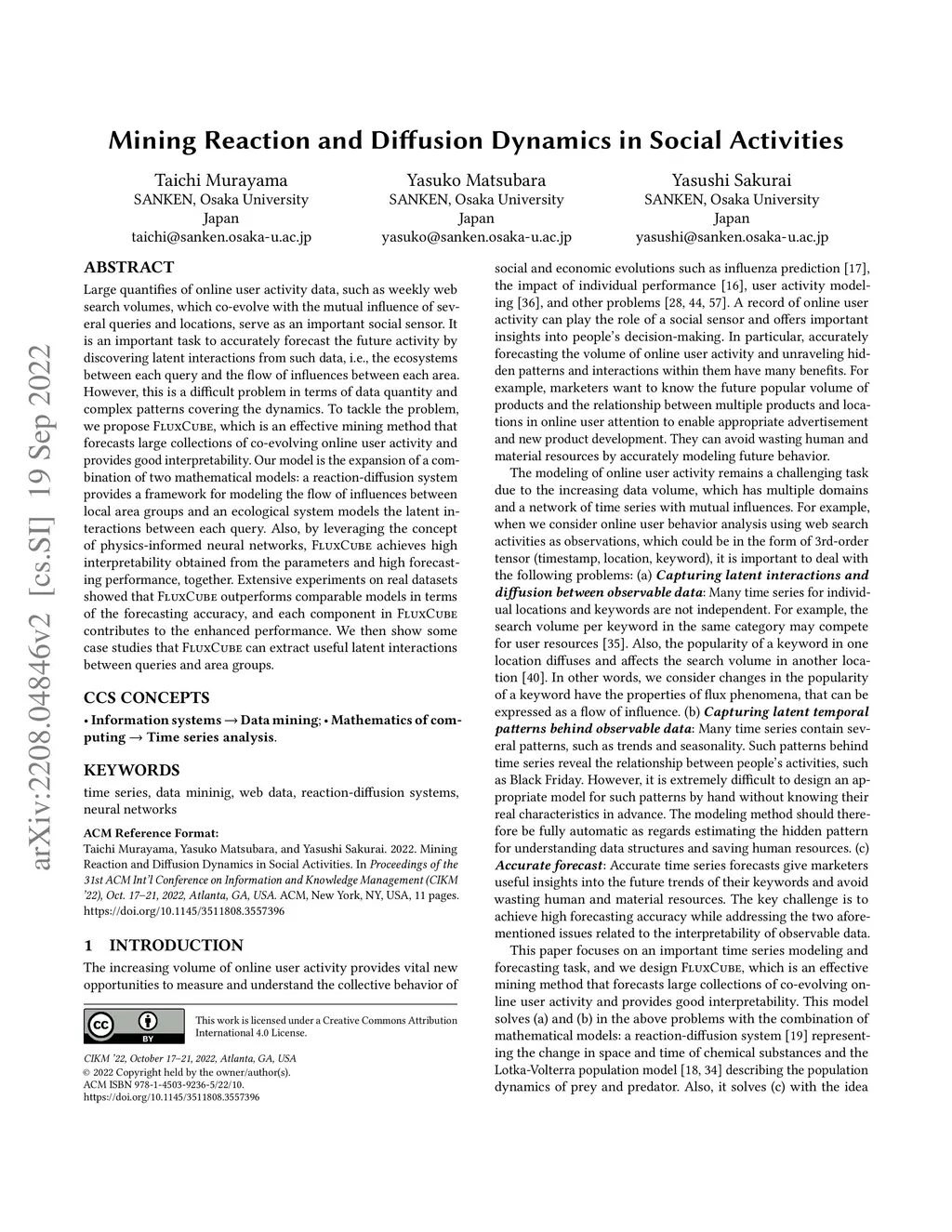 Large quantifies of online user activity data, such as weekly web search volumes, which co-evolve with the mutual influence of several queries and locations, serve as an important social sensor. It is an important task to accurately forecast the future activity by discovering latent interactions from such data, i.e., the ecosystems between each query and the flow of influences between each area. However, this is a difficult problem in terms of data quantity and complex patterns covering the dynamics. To tackle the problem, we propose FluxCube, which is an effective mining method that forecasts large collections of co-evolving online user activity and provides good interpretability. Our model is the expansion of a combination of two mathematical models: a reaction-diffusion system provides a framework for modeling the flow of influences between local area groups and an ecological system models the latent interactions between each query. Also, by leveraging the concept of physics-informed neural networks, FluxCube achieves high interpretability obtained from the parameters and high forecasting performance, together. Extensive experiments on real datasets showed that FluxCube outperforms comparable models in terms of the forecasting accuracy, and each component in FluxCube contributes to the enhanced performance. We then show some case studies that FluxCube can extract useful latent interactions between queries and area groups.