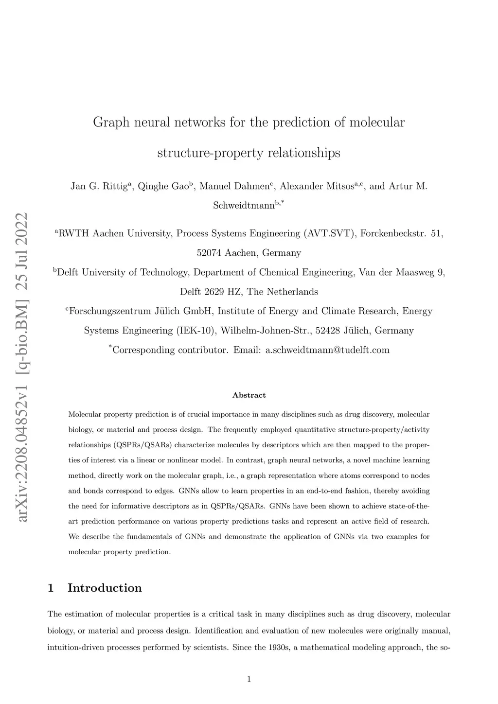 Molecular property prediction is of crucial importance in many disciplines such as drug discovery, molecular biology, or material and process design. The frequently employed quantitative structure-property/activity relationships (QSPRs/QSARs) characterize molecules by descriptors which are then mapped to the properties of interest via a linear or nonlinear model. In contrast, graph neural networks, a novel machine learning method, directly work on the molecular graph, i.e., a graph representation where atoms correspond to nodes and bonds correspond to edges. GNNs allow to learn properties in an end-to-end fashion, thereby avoiding the need for informative descriptors as in QSPRs/QSARs. GNNs have been shown to achieve state-of-the-art prediction performance on various property predictions tasks and represent an active field of research. We describe the fundamentals of GNNs and demonstrate the application of GNNs via two examples for molecular property prediction.