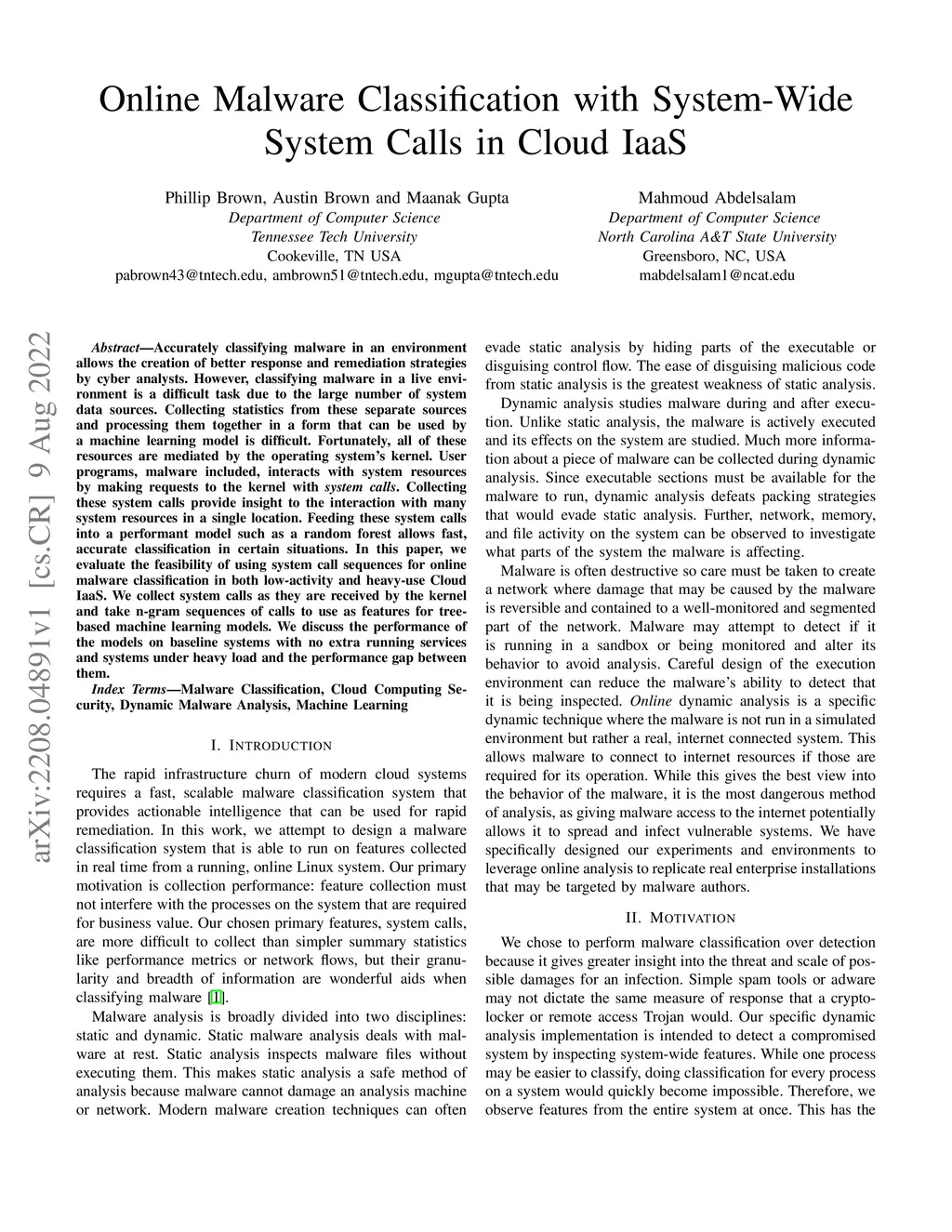 Accurately classifying malware in an environment allows the creation of better response and remediation strategies by cyber analysts. However, classifying malware in a live environment is a difficult task due to the large number of system data sources. Collecting statistics from these separate sources and processing them together in a form that can be used by a machine learning model is difficult. Fortunately, all of these resources are mediated by the operating system's kernel. User programs, malware included, interacts with system resources by making requests to the kernel with system calls. Collecting these system calls provide insight to the interaction with many system resources in a single location. Feeding these system calls into a performant model such as a random forest allows fast, accurate classification in certain situations. In this paper, we evaluate the feasibility of using system call sequences for online malware classification in both low-activity and heavy-use Cloud IaaS. We collect system calls as they are received by the kernel and take n-gram sequences of calls to use as features for tree-based machine learning models. We discuss the performance of the models on baseline systems with no extra running services and systems under heavy load and the performance gap between them.