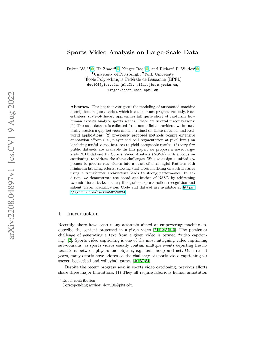 This paper investigates the modeling of automated machine description on sports video, which has seen much progress recently. Nevertheless, state-of-the-art approaches fall quite short of capturing how human experts analyze sports scenes. There are several major reasons: (1) The used dataset is collected from non-official providers, which naturally creates a gap between models trained on those datasets and real-world applications; (2) previously proposed methods require extensive annotation efforts (i.e., player and ball segmentation at pixel level) on localizing useful visual features to yield acceptable results; (3) very few public datasets are available. In this paper, we propose a novel large-scale NBA dataset for Sports Video Analysis (NSVA) with a focus on captioning, to address the above challenges. We also design a unified approach to process raw videos into a stack of meaningful features with minimum labelling efforts, showing that cross modeling on such features using a transformer architecture leads to strong performance. In addition, we demonstrate the broad application of NSVA by addressing two additional tasks, namely fine-grained sports action recognition and salient player identification. Code and dataset are available at https://github.com/jackwu502/NSVA.