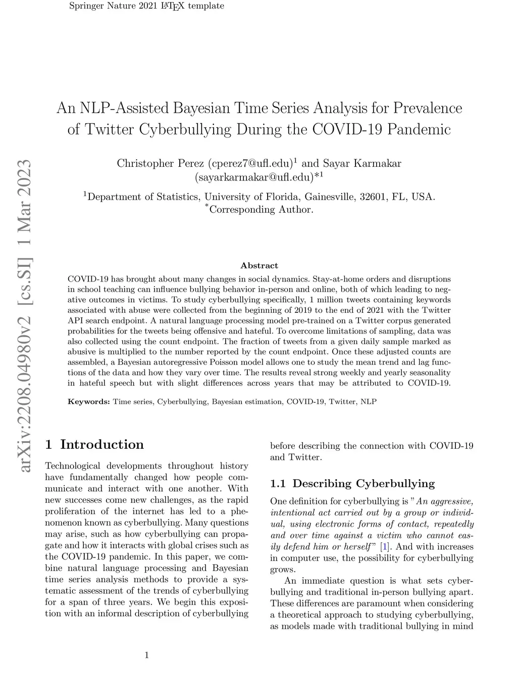 COVID-19 has brought about many changes in social dynamics. Stay-at-home orders and disruptions in school teaching can influence bullying behavior in-person and online, both of which leading to negative outcomes in victims. To study cyberbullying specifically, 1 million tweets containing keywords associated with abuse were collected from the beginning of 2019 to the end of 2021 with the Twitter API search endpoint. A natural language processing model pre-trained on a Twitter corpus generated probabilities for the tweets being offensive and hateful. To overcome limitations of sampling, data was also collected using the count endpoint. The fraction of tweets from a given daily sample marked as abusive is multiplied to the number reported by the count endpoint. Once these adjusted counts are assembled, a Bayesian autoregressive Poisson model allows one to study the mean trend and lag functions of the data and how they vary over time. The results reveal strong weekly and yearly seasonality in hateful speech but with slight differences across years that may be attributed to COVID-19.