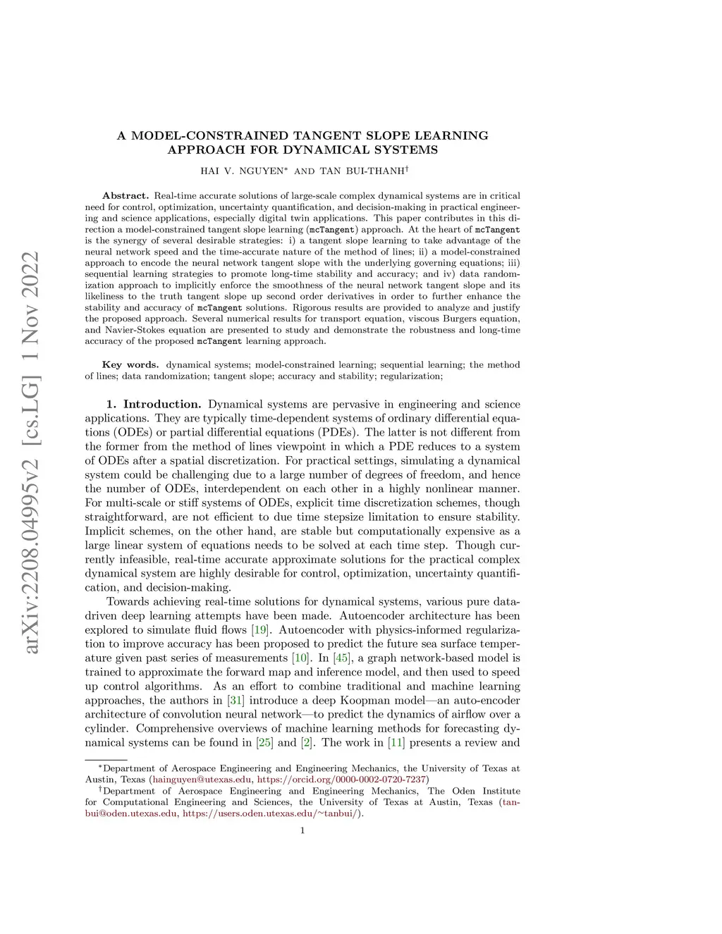 Real-time accurate solutions of large-scale complex dynamical systems are in critical need for control, optimization, uncertainty quantification, and decision-making in practical engineering and science applications, especially digital twin applications. This paper contributes in this direction a model-constrained tangent slope learning (mcTangent) approach. At the heart of mcTangent is the synergy of several desirable strategies: i) a tangent slope learning to take advantage of the neural network speed and the time-accurate nature of the method of lines; ii) a model-constrained approach to encode the neural network tangent slope with the underlying governing equations; iii) sequential learning strategies to promote long-time stability and accuracy; and iv) data randomization approach to implicitly enforce the smoothness of the neural network tangent slope and its likeliness to the truth tangent slope up second order derivatives in order to further enhance the stability and accuracy of mcTangent solutions. Rigorous results are provided to analyze and justify the proposed approach. Several numerical results for the transport equation, viscous Burgers equation, and Navier-Stokes equation are presented to study and demonstrate the robustness and long-time accuracy of the proposed mcTangent learning approach.