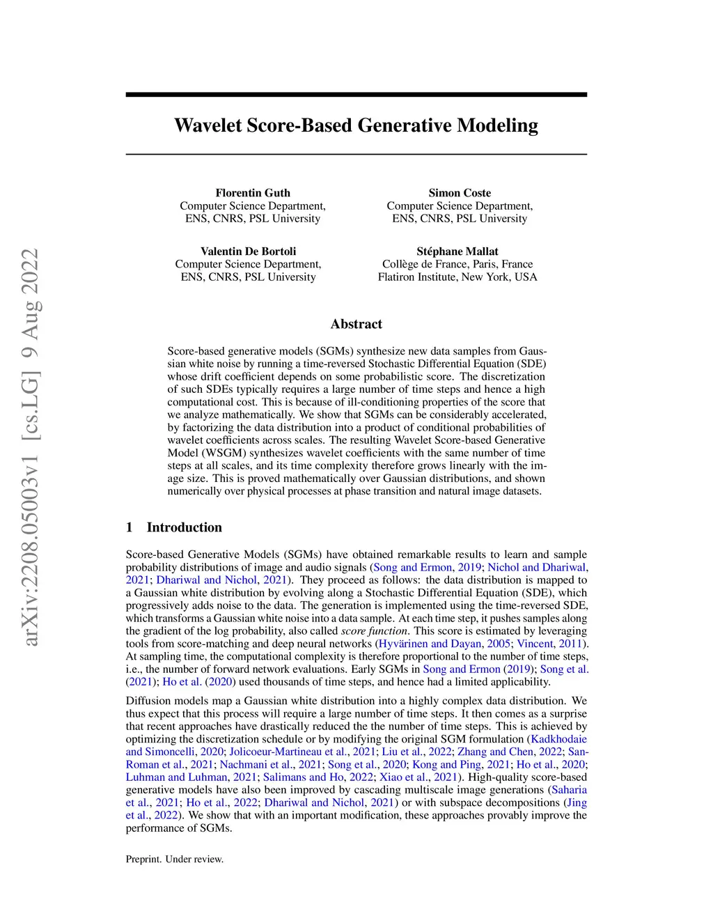 Score-based generative models (SGMs) synthesize new data samples from Gaussian white noise by running a time-reversed Stochastic Differential Equation (SDE) whose drift coefficient depends on some probabilistic score. The discretization of such SDEs typically requires a large number of time steps and hence a high computational cost. This is because of ill-conditioning properties of the score that we analyze mathematically. We show that SGMs can be considerably accelerated, by factorizing the data distribution into a product of conditional probabilities of wavelet coefficients across scales. The resulting Wavelet Score-based Generative Model (WSGM) synthesizes wavelet coefficients with the same number of time steps at all scales, and its time complexity therefore grows linearly with the image size. This is proved mathematically over Gaussian distributions, and shown numerically over physical processes at phase transition and natural image datasets.