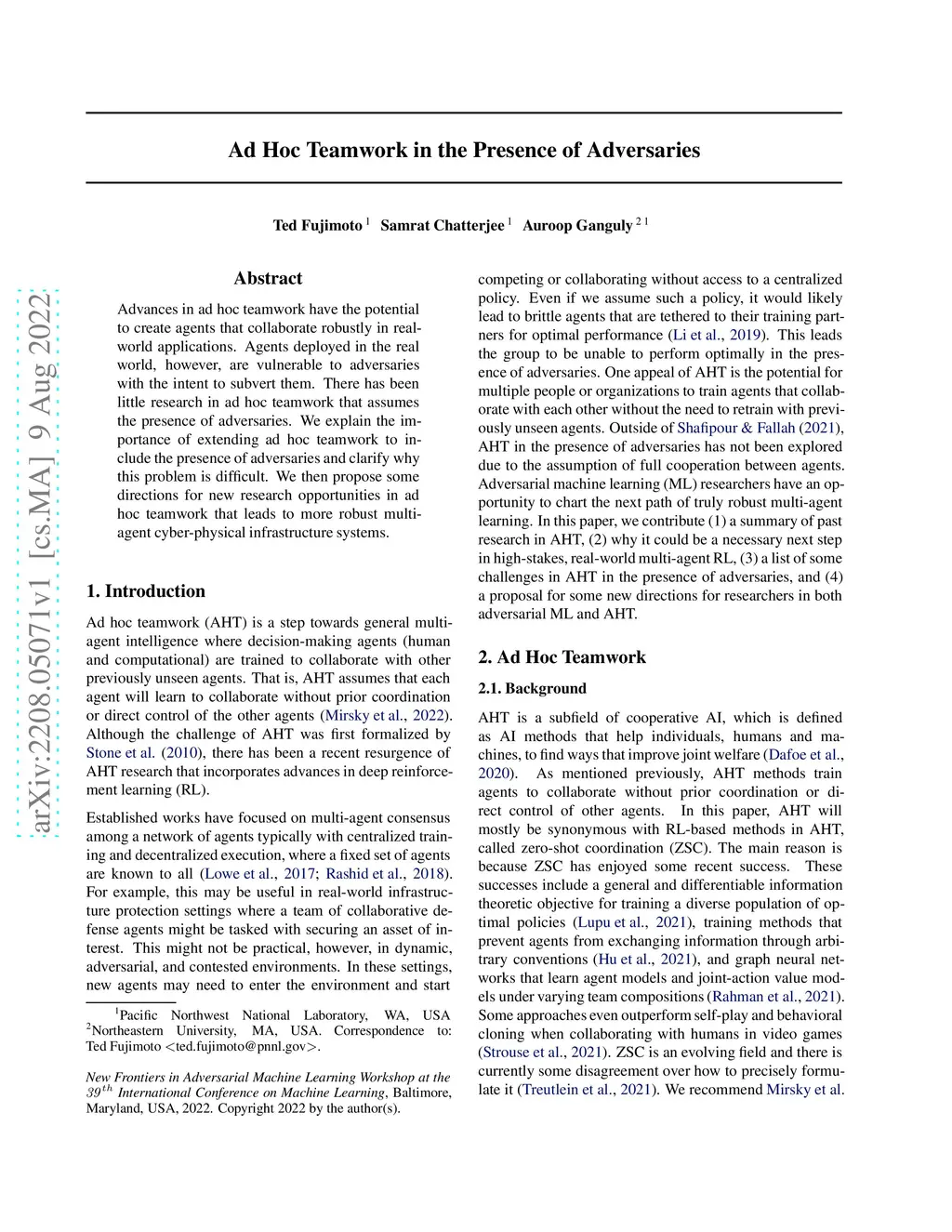 Advances in ad hoc teamwork have the potential to create agents that collaborate robustly in real-world applications. Agents deployed in the real world, however, are vulnerable to adversaries with the intent to subvert them. There has been little research in ad hoc teamwork that assumes the presence of adversaries. We explain the importance of extending ad hoc teamwork to include the presence of adversaries and clarify why this problem is difficult. We then propose some directions for new research opportunities in ad hoc teamwork that leads to more robust multi-agent cyber-physical infrastructure systems.