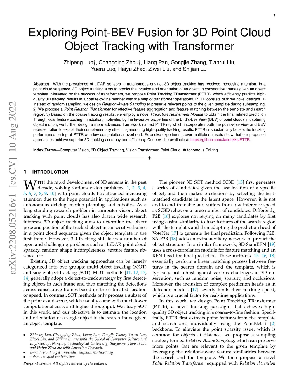 With the prevalence of LiDAR sensors in autonomous driving, 3D object tracking has received increasing attention. In a point cloud sequence, 3D object tracking aims to predict the location and orientation of an object in consecutive frames given an object template. Motivated by the success of transformers, we propose Point Tracking TRansformer (PTTR), which efficiently predicts high-quality 3D tracking results in a coarse-to-fine manner with the help of transformer operations. PTTR consists of three novel designs. 1) Instead of random sampling, we design Relation-Aware Sampling to preserve relevant points to the given template during subsampling. 2) We propose a Point Relation Transformer for effective feature aggregation and feature matching between the template and search region. 3) Based on the coarse tracking results, we employ a novel Prediction Refinement Module to obtain the final refined prediction through local feature pooling. In addition, motivated by the favorable properties of the Bird's-Eye View (BEV) of point clouds in capturing object motion, we further design a more advanced framework named PTTR++, which incorporates both the point-wise view and BEV representation to exploit their complementary effect in generating high-quality tracking results. PTTR++ substantially boosts the tracking performance on top of PTTR with low computational overhead. Extensive experiments over multiple datasets show that our proposed approaches achieve superior 3D tracking accuracy and efficiency.