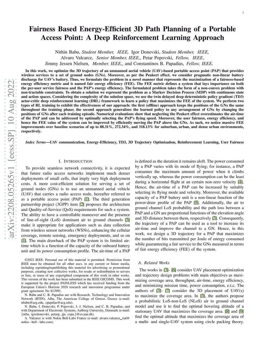 In this work, we optimize the 3D trajectory of an unmanned aerial vehicle (UAV)-based portable access point (PAP) that provides wireless services to a set of ground nodes (GNs). Moreover, as per the Peukert effect, we consider pragmatic non-linear battery discharge for the battery of the UAV. Thus, we formulate the problem in a novel manner that represents the maximization of a fairness-based energy efficiency metric and is named fair energy efficiency (FEE). The FEE metric defines a system that lays importance on both the per-user service fairness and the energy efficiency of the PAP. The formulated problem takes the form of a non-convex problem with non-tractable constraints. To obtain a solution, we represent the problem as a Markov Decision Process (MDP) with continuous state and action spaces. Considering the complexity of the solution space, we use the twin delayed deep deterministic policy gradient (TD3) actor-critic deep reinforcement learning (DRL) framework to learn a policy that maximizes the FEE of the system. We perform two types of RL training to exhibit the effectiveness of our approach: the first (offline) approach keeps the positions of the GNs the same throughout the training phase; the second approach generalizes the learned policy to any arrangement of GNs by changing the positions of GNs after each training episode. Numerical evaluations show that neglecting the Peukert effect overestimates the air-time of the PAP and can be addressed by optimally selecting the PAP's flying speed. Moreover, the user fairness, energy efficiency, and hence the FEE value of the system can be improved by efficiently moving the PAP above the GNs. As such, we notice massive FEE improvements over baseline scenarios of up to 88.31%, 272.34%, and 318.13% for suburban, urban, and dense urban environments, respectively.