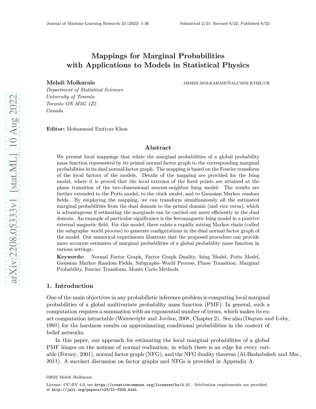 We present local mappings that relate the marginal probabilities of a global probability mass function represented by its primal normal factor graph to the corresponding marginal probabilities in its dual normal factor graph. The mapping is based on the Fourier transform of the local factors of the models. Details of the mapping are provided for the Ising model, where it is proved that the local extrema of the fixed points are attained at the phase transition of the two-dimensional nearest-neighbor Ising model. The results are further extended to the Potts model, to the clock model, and to Gaussian Markov random fields. By employing the mapping, we can transform simultaneously all the estimated marginal probabilities from the dual domain to the primal domain (and vice versa), which is advantageous if estimating the marginals can be carried out more efficiently in the dual domain. An example of particular significance is the ferromagnetic Ising model in a positive external magnetic field. For this model, there exists a rapidly mixing Markov chain (called the subgraphs--world process) to generate configurations in the dual normal factor graph of the model. Our numerical experiments illustrate that the proposed procedure can provide more accurate estimates of marginal probabilities of a global probability mass function in various settings.