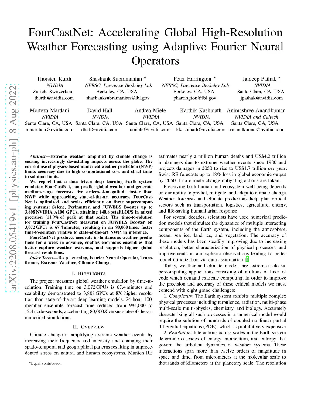 Extreme weather amplified by climate change is causing increasingly devastating impacts across the globe. The current use of physics-based numerical weather prediction (NWP) limits accuracy due to high computational cost and strict time-to-solution limits. We report that a data-driven deep learning Earth system emulator, FourCastNet, can predict global weather and generate medium-range forecasts five orders-of-magnitude faster than NWP while approaching state-of-the-art accuracy. FourCast-Net is optimized and scales efficiently on three supercomputing systems: Selene, Perlmutter, and JUWELS Booster up to 3,808 NVIDIA A100 GPUs, attaining 140.8 petaFLOPS in mixed precision (11.9%of peak at that scale). The time-to-solution for training FourCastNet measured on JUWELS Booster on 3,072GPUs is 67.4minutes, resulting in an 80,000times faster time-to-solution relative to state-of-the-art NWP, in inference. FourCastNet produces accurate instantaneous weather predictions for a week in advance, enables enormous ensembles that better capture weather extremes, and supports higher global forecast resolutions.