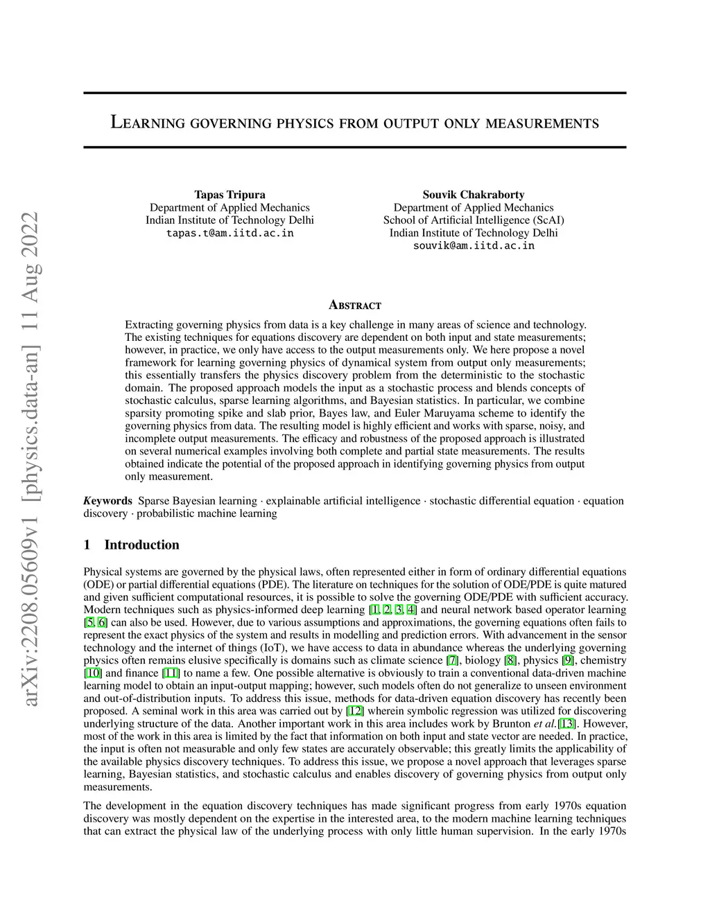 Extracting governing physics from data is a key challenge in many areas of science and technology. The existing techniques for equations discovery are dependent on both input and state measurements; however, in practice, we only have access to the output measurements only. We here propose a novel framework for learning governing physics of dynamical system from output only measurements; this essentially transfers the physics discovery problem from the deterministic to the stochastic domain. The proposed approach models the input as a stochastic process and blends concepts of stochastic calculus, sparse learning algorithms, and Bayesian statistics. In particular, we combine sparsity promoting spike and slab prior, Bayes law, and Euler Maruyama scheme to identify the governing physics from data. The resulting model is highly efficient and works with sparse, noisy, and incomplete output measurements. The efficacy and robustness of the proposed approach is illustrated on several numerical examples involving both complete and partial state measurements. The results obtained indicate the potential of the proposed approach in identifying governing physics from output only measurement.