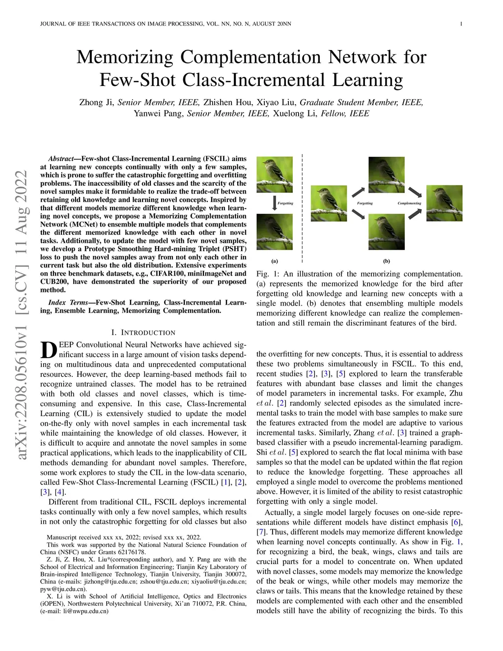 Few-shot Class-Incremental Learning (FSCIL) aims at learning new concepts continually with only a few samples, which is prone to suffer the catastrophic forgetting and overfitting problems. The inaccessibility of old classes and the scarcity of the novel samples make it formidable to realize the trade-off between retaining old knowledge and learning novel concepts. Inspired by that different models memorize different knowledge when learning novel concepts, we propose a Memorizing Complementation Network (MCNet) to ensemble multiple models that complements the different memorized knowledge with each other in novel tasks. Additionally, to update the model with few novel samples, we develop a Prototype Smoothing Hard-mining Triplet (PSHT) loss to push the novel samples away from not only each other in current task but also the old distribution. Extensive experiments on three benchmark datasets, e.g., CIFAR100, miniImageNet and CUB200, have demonstrated the superiority of our proposed method.