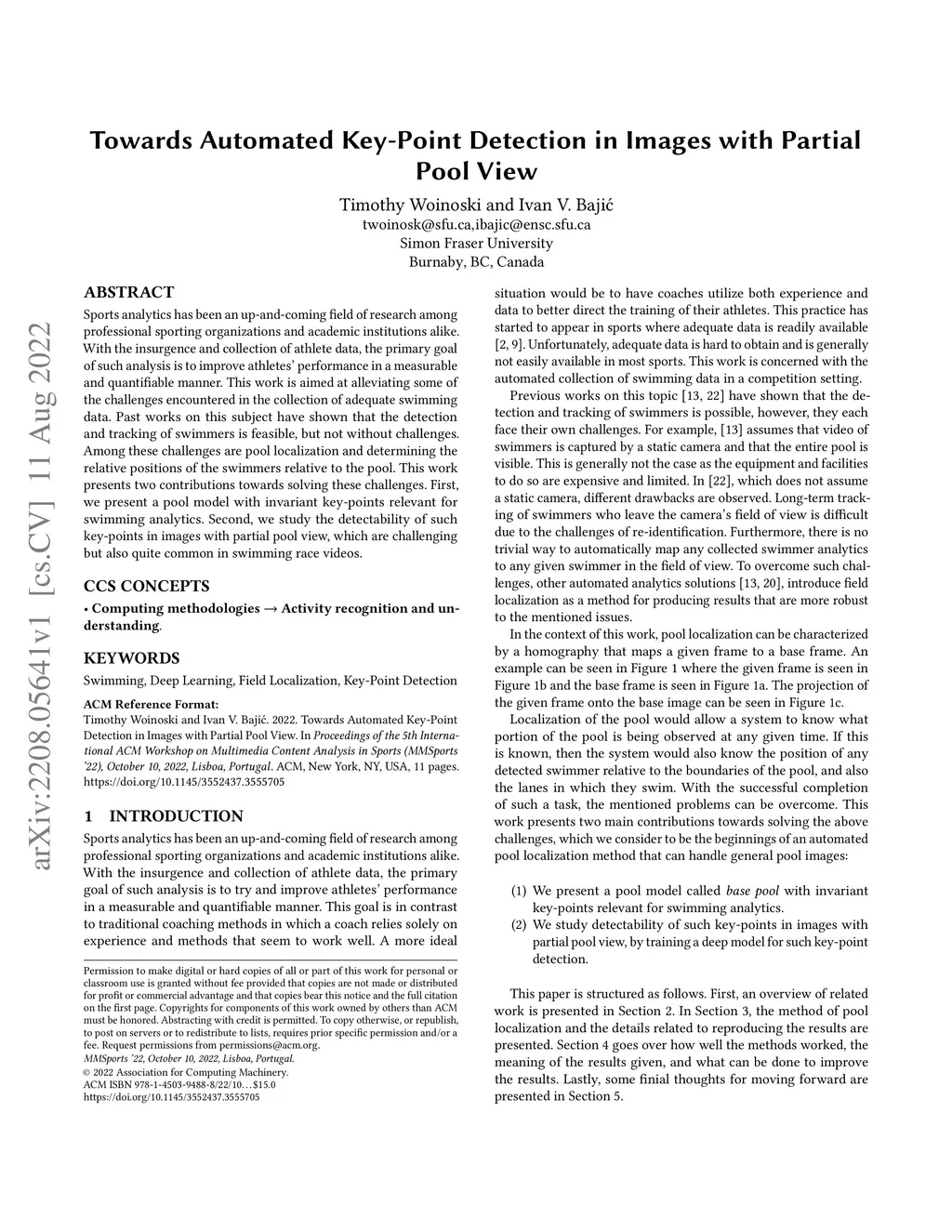 Sports analytics has been an up-and-coming field of research among professional sporting organizations and academic institutions alike. With the insurgence and collection of athlete data, the primary goal of such analysis is to improve athletes' performance in a measurable and quantifiable manner. This work is aimed at alleviating some of the challenges encountered in the collection of adequate swimming data. Past works on this subject have shown that the detection and tracking of swimmers is feasible, but not without challenges. Among these challenges are pool localization and determining the relative positions of the swimmers relative to the pool. This work presents two contributions towards solving these challenges. First, we present a pool model with invariant key-points relevant for swimming analytics. Second, we study the detectability of such key-points in images with partial pool view, which are challenging but also quite common in swimming race videos.